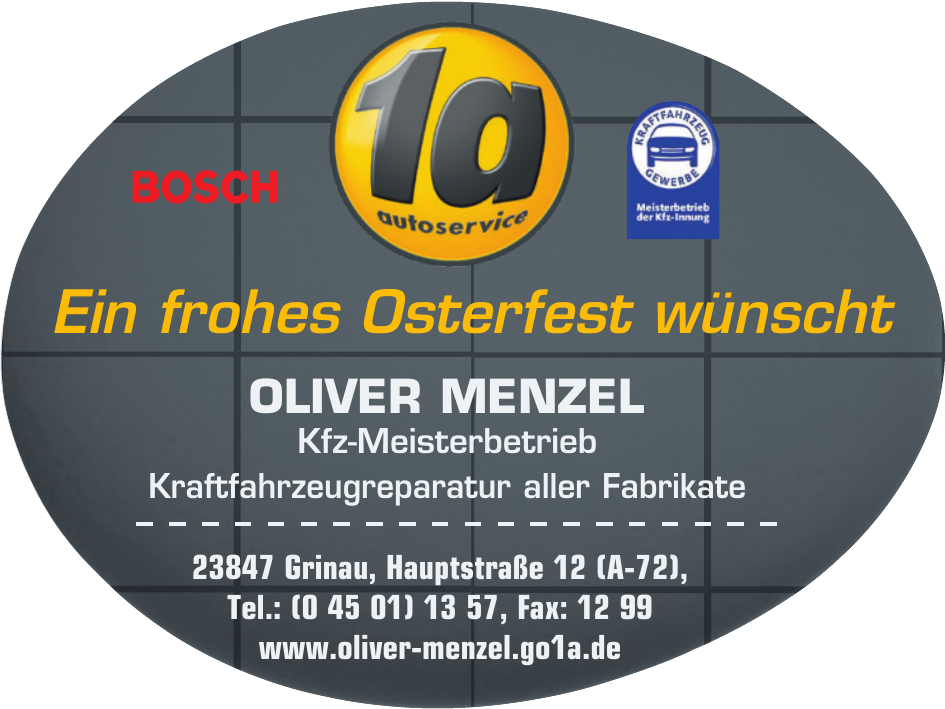 Die 1a Autoservice Oliver Menzel ist eine Kfz-Werkstatt mit Sitz in Grinau in Schleswig-Holstein. Als Teil des Werkstattkonzepts 1a autoservice bietet der Betrieb umfassenden Service für Fahrzeuge unterschiedlichster Hersteller. Ob Audi, BMW, Opel, Ford, Volkswagen, Peugeot, Toyota oder Mercedes – die Werkstatt ist auf die Wartung und Reparatur von Pkw aller Marken ausgerichtet und betreut sowohl Neuwagen als auch ältere Fahrzeuge.