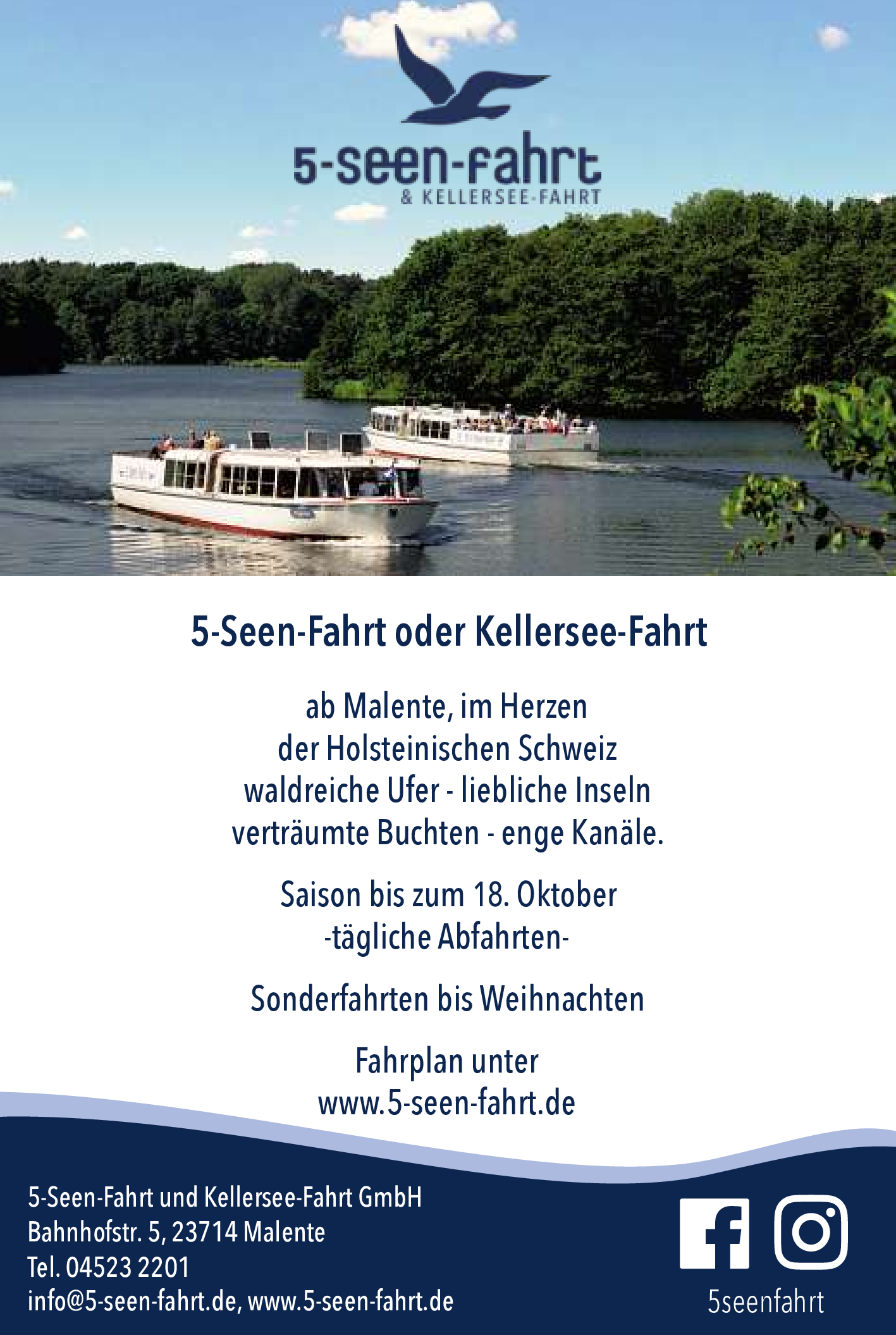 Das Unternehmen bietet Rundfahrten auf den 5 Seen zwischen Malente und Plön (5-Seen-Fahrt) sowie Rundfahrten auf dem Kellersee (Kellersee-Fahrt) an. Die 5-Seen-Fahrt führt über Dieksee, Langensee, Behlersee, Höftsee und Edebergsee, während die Kellersee-Fahrt entlang des Ufers bis zur Seehütte Malente führt und unter anderem das Gut Rothensande passiert.