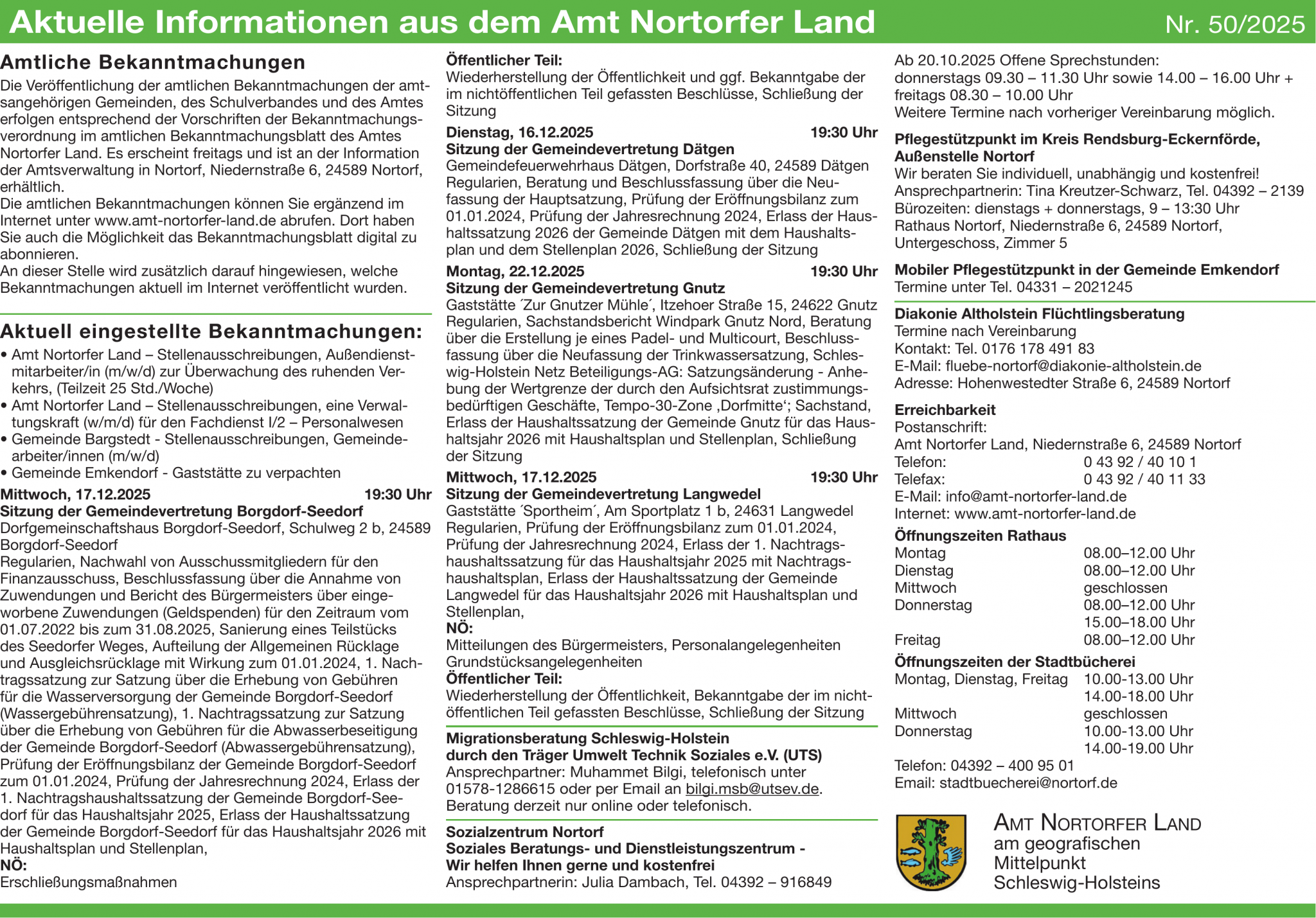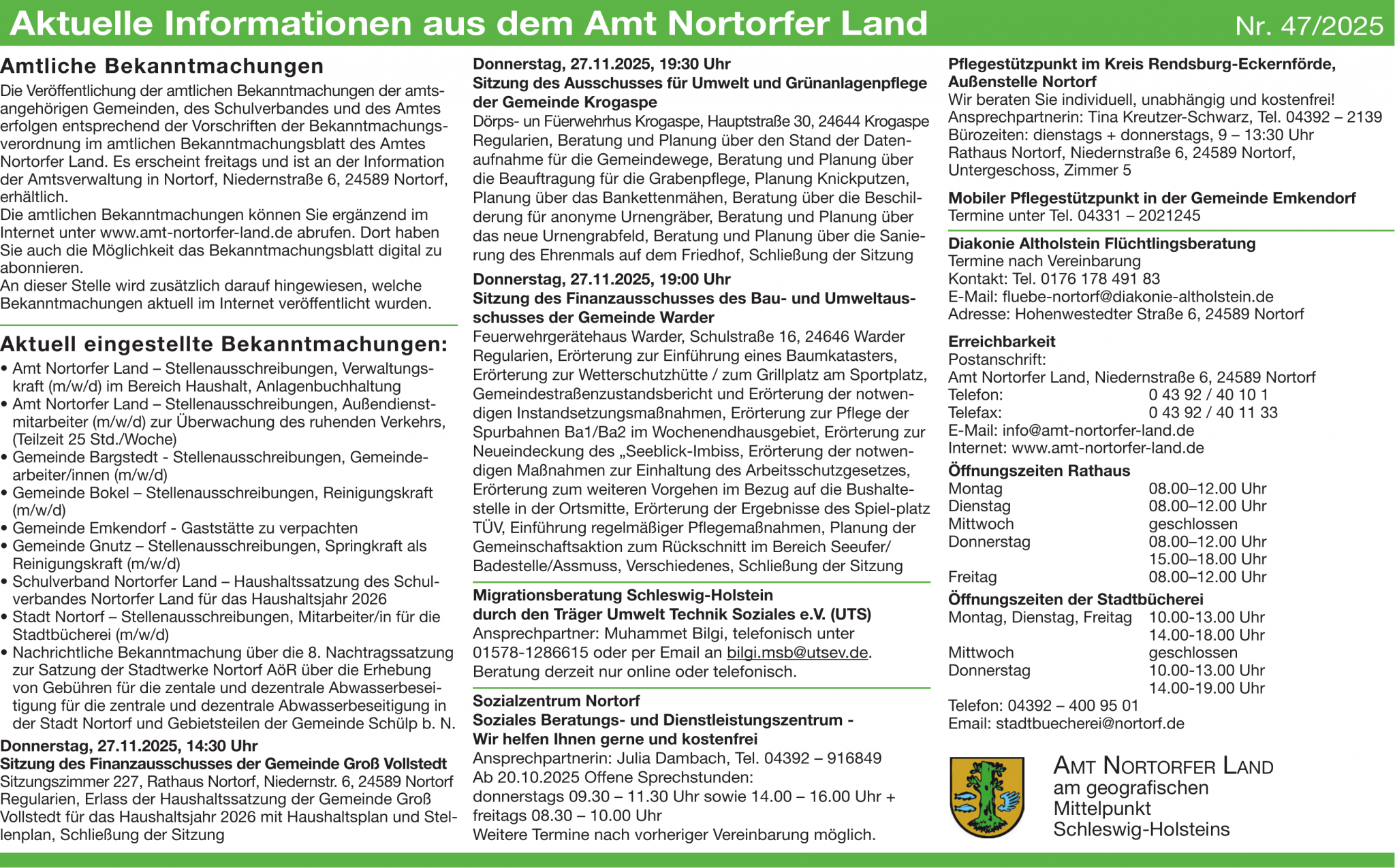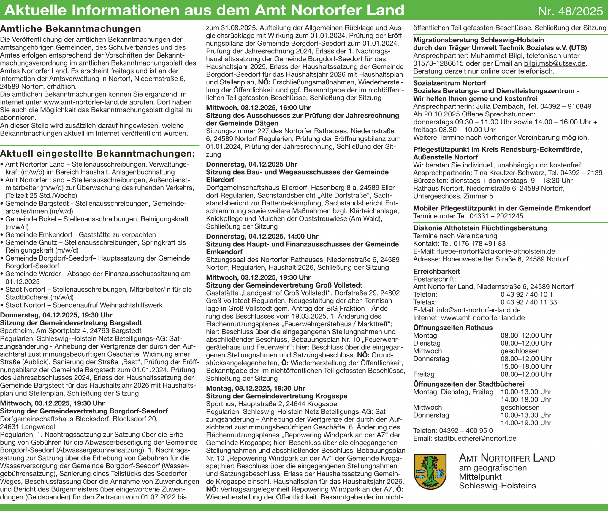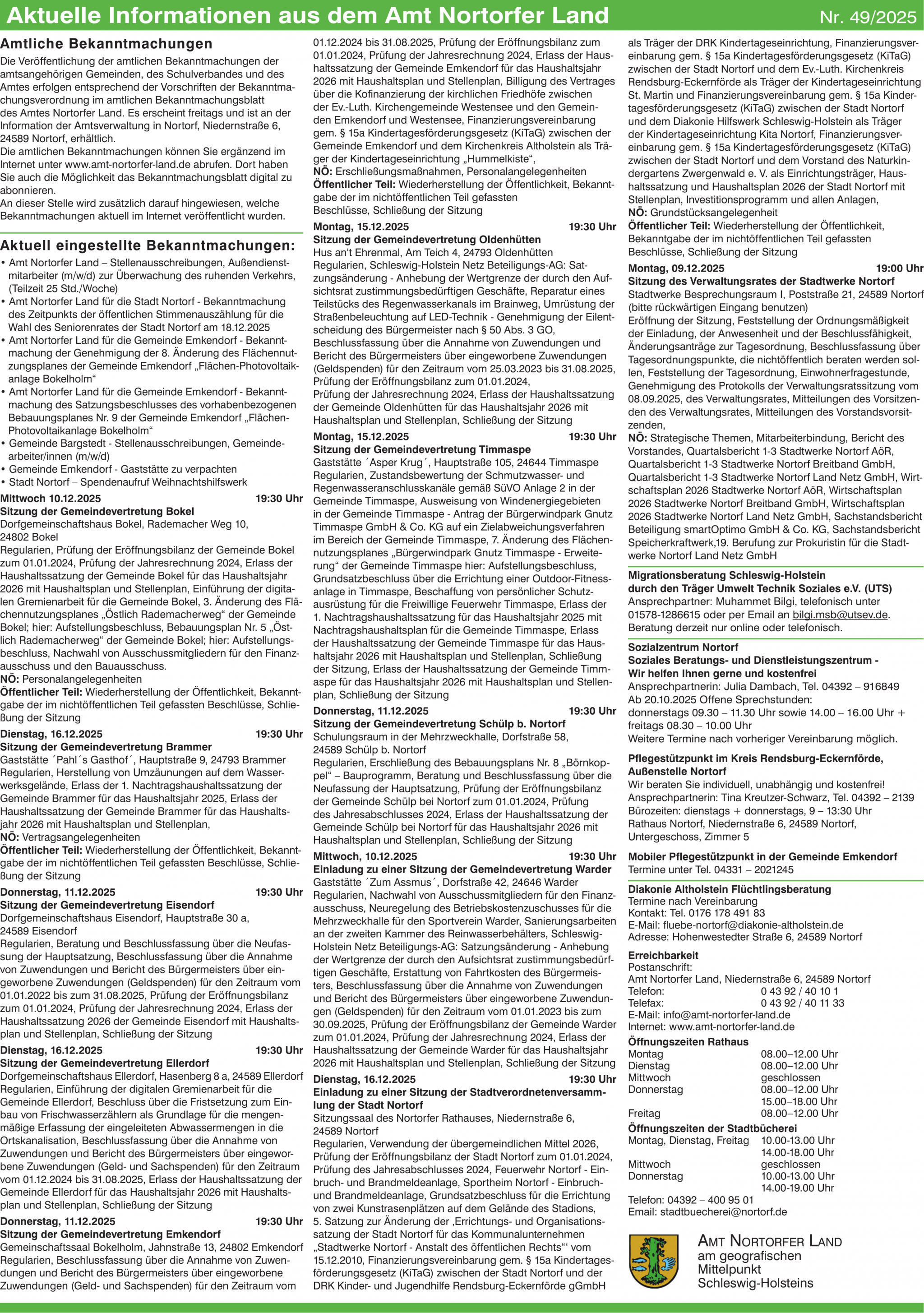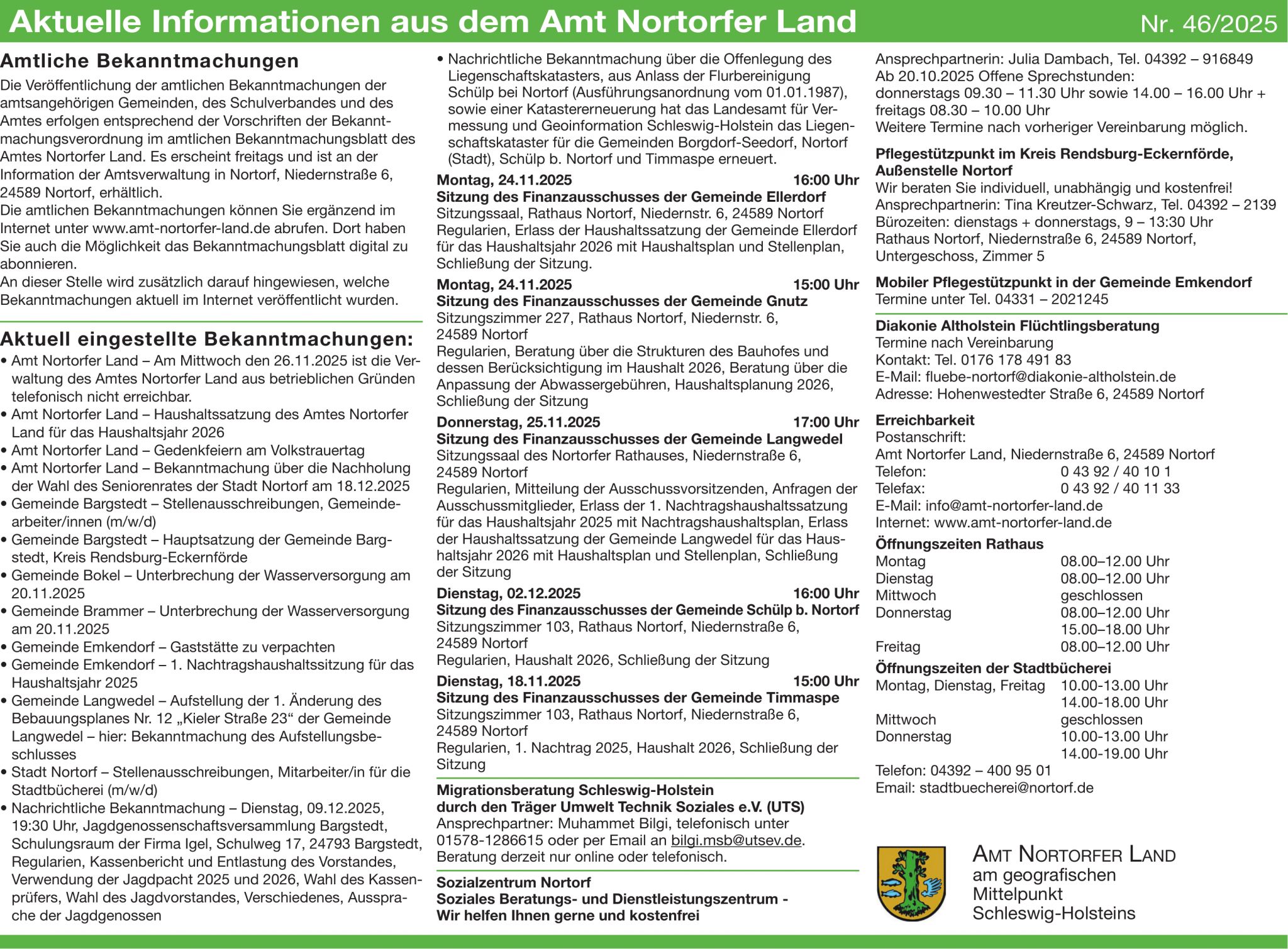 • Amt Nortorfer Land - Haushaltssatzung des Amtes Nortorfer Land für das Haushaltsjahr 2026 Amt Nortorfer Land - Gedenkfeiern am Volkstrauertag Amt Nortorfer Land - Bekanntmachung über die Nachholung der Wahl des Seniorenrates der Stadt Nortorf am 18.12.2025