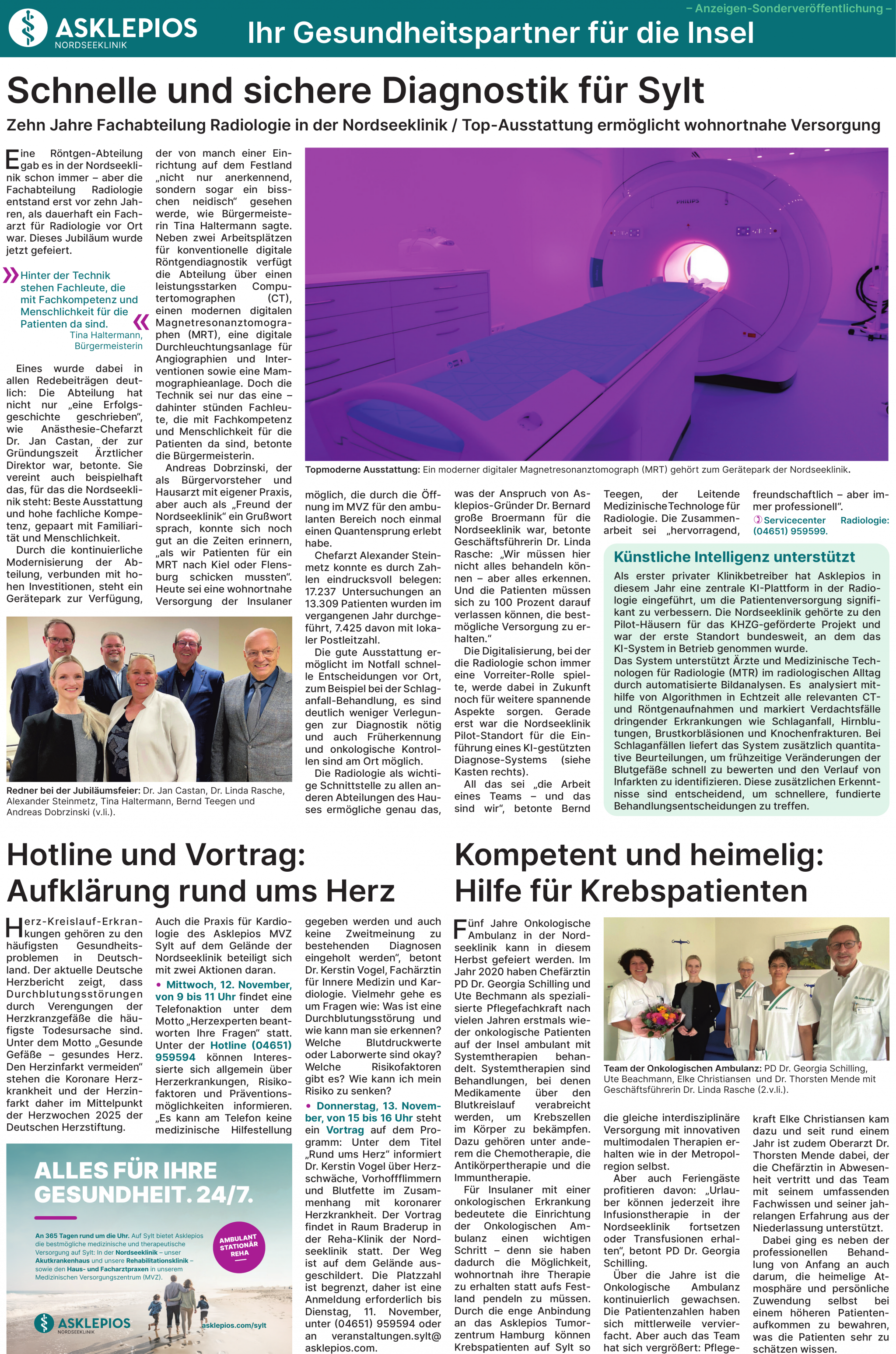 Die Asklepios Nordseeklinik Westerland auf Sylt bietet spezialisierte Behandlungen in den Bereichen Akutmedizin, Rehabilitationsmedizin, Neurologie, Orthopädie, Herz- und Gefäßmedizin sowie Psychiatrie und Psychosomatik an.