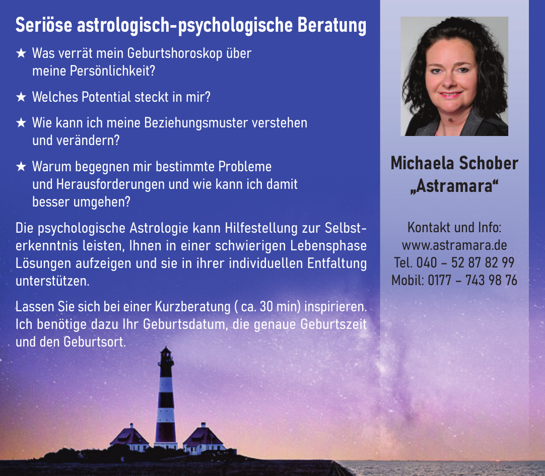 Astrologische Beratung Hamburg - Astramara bietet: Ausführliche Persönlichkeitsanalyse anhand des Geburtshoroskops inkl. Stärken, Schwächen, Talente, Fähigkeiten (150,00 €); Astrologisch-psychologische Beratung zu ein bis zwei Lebensbereichen (130,00 €); Jahresprognose anhand des Solarhoroskops (180,00 €); Folgeberatung innerhalb von 3 Monaten, ca. 60 Minuten (80,00 €). Alle Beratungen beinhalten ein telefonisches Vorgespräch, ein Beratungsgespräch und auf Wunsch eine Audioaufzeichnung.