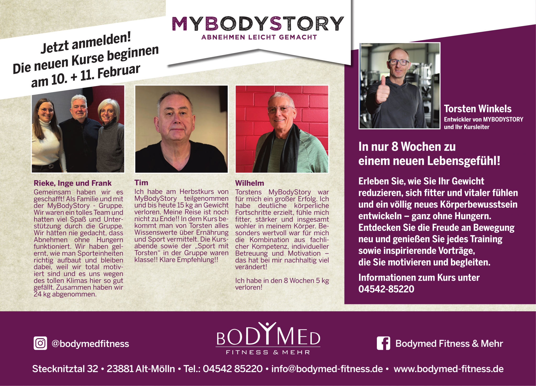 Sie können eine kostenlose Probewoche mit persönlichem Fitness-Check bei Bodymed Fitness & Mehr in Alt-Mölln buchen, um das Studio unverbindlich kennenzulernen.