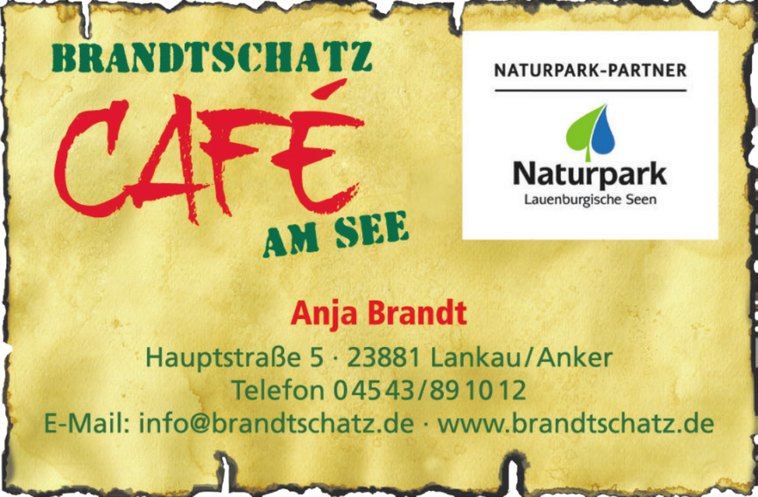 Brandtschatz Café am See liegt in der Hauptstraße 5, 23881 Lankau/Anker, am Anker See. Das Café steht in einer malerischen Umgebung des Naturparks Lauenburgische Seen und bietet Terrasse, Garten und Blick auf den See.