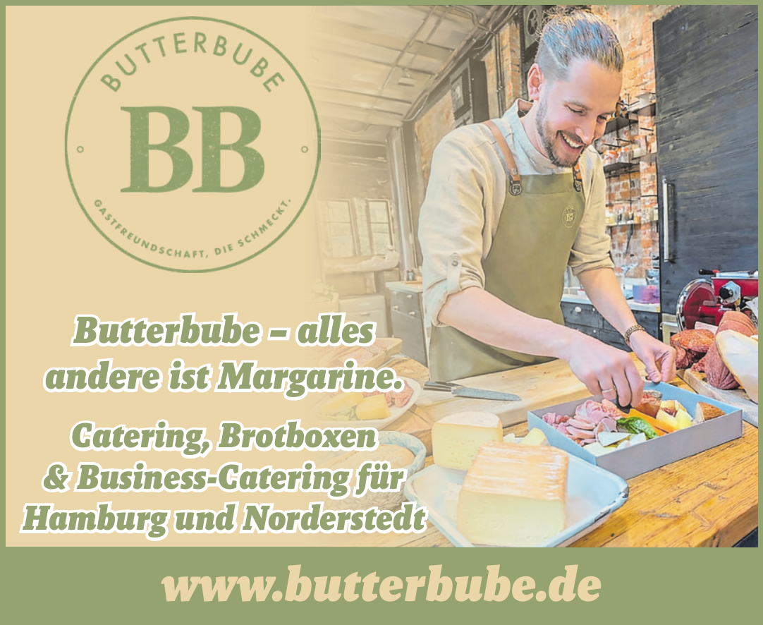 Butterbube ist ein Catering-Unternehmen aus Hamburg, das sich auf kreative Charcuterie-Boards, vielseitige Genuss-Boxen und die persönliche Ausrichtung privater sowie geschäftlicher Veranstaltungen spezialisiert hat. Im Mittelpunkt steht die Gastgeberkultur, bei der das gemeinsame Essen am gedeckten Tisch und der direkte Austausch mit den Gästen im Vordergrund stehen. Statt klassischer Buffets oder formeller Abläufe schafft Butterbube eine entspannte Atmosphäre mit hochwertigen Zutaten, die überwiegend von regionalen Betrieben aus Hamburg und Umgebung stammen. Die Unternehmensphilosophie, verkörpert durch den Slogan „Butterbube. Alles andere ist Margarine.“, betont Einfachheit, Gastfreundschaft und Wertschätzung.