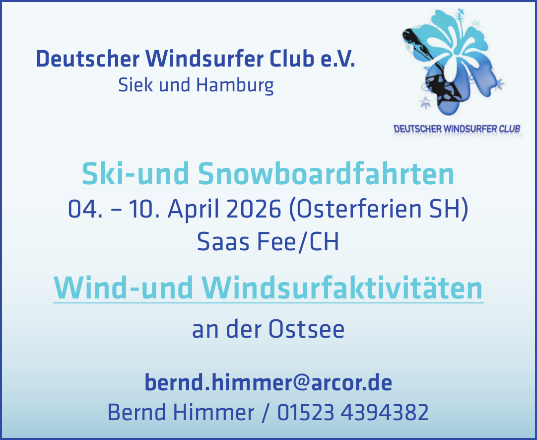 Der Deutscher Windsurfer Club e.V. (DWSC) ist ein Verein mit Sitz in Siek bei Hamburg, der sich dem Windsurfsport und weiteren Wassersport‑ sowie Outdooraktivitäten widmet. Der Verein bietet in der neuen Saison wieder Kurse und Wochenprogramme zum Windsurfen an, darunter speziell konzipierte Anfänger‑ und Fortgeschrittenenkurse sowie Ganztagsbetreuung für Kinder und Jugendliche zwischen 10 und 18 Jahren.