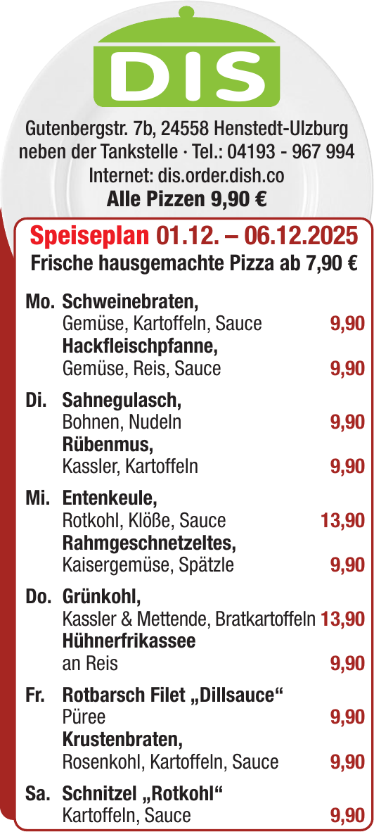 Das DIS Restaurant in der Gutenbergstraße 7b, 24558 Henstedt-Ulzburg neben der Tankstelle bietet eine Vielzahl von Gerichten an, darunter Pizza, Salate, Pasta, Fleischgerichte, Schnitzel, Currywurst Chicken, Frühstück Kuchen, sowie alkoholfreie und alkoholische Getränke.