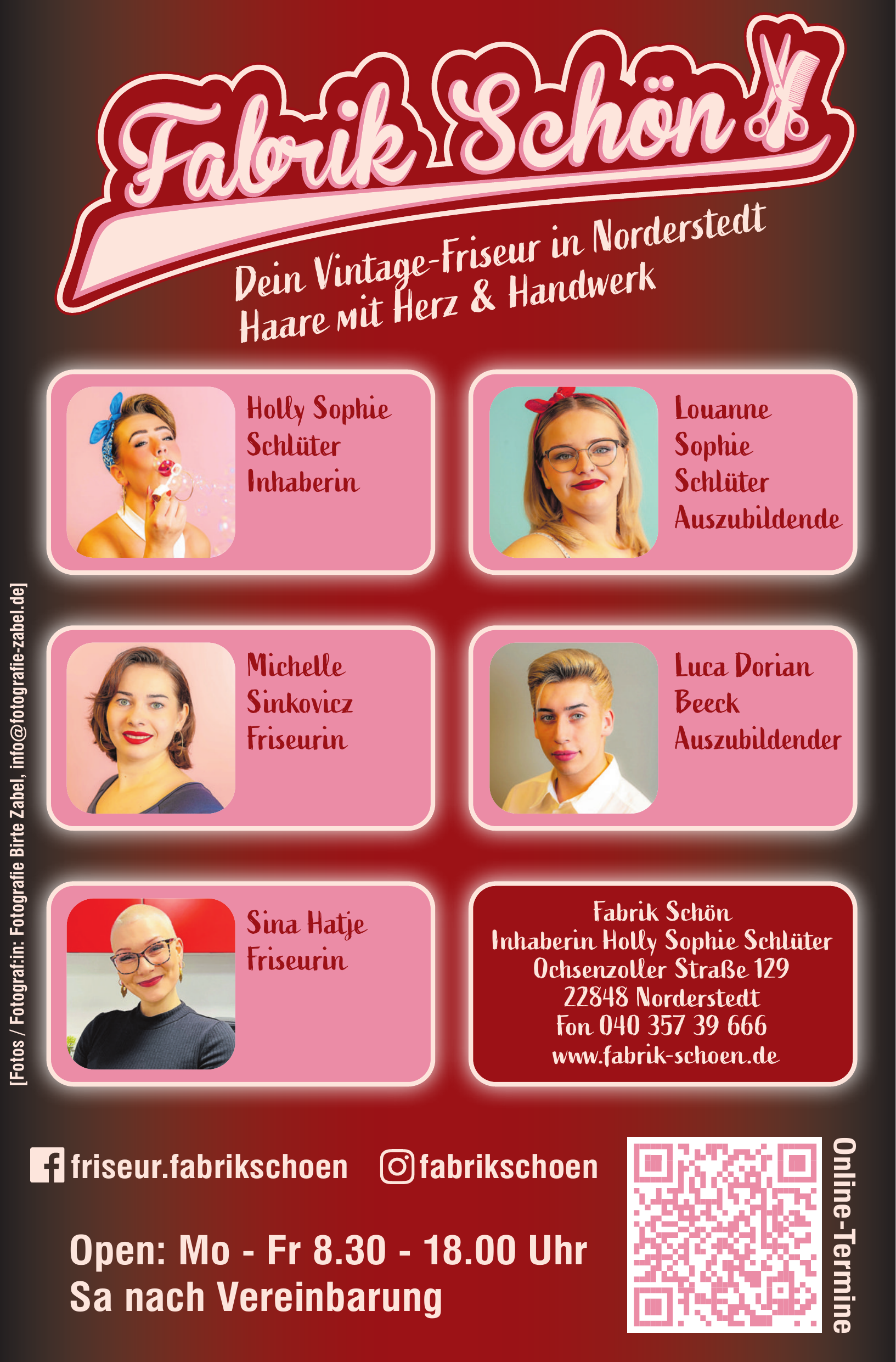 Fabrik Schön ist ein Friseursalon in Norderstedt, der aktuelle Farb- und Schnitttechniken mit Frisuren und Styles im Vintagelook verbindet. Der Betrieb beschreibt sich als Friseurgeschäft mit Herz und Haltung und setzt auf ein Ambiente im Look der 50er Jahre.