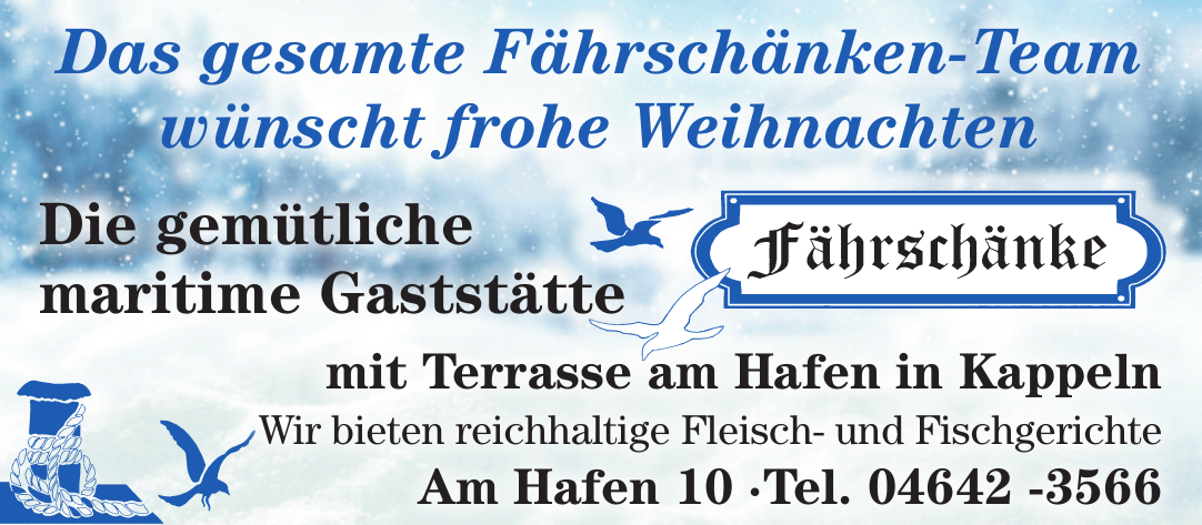 Sie können die Fährschänke telefonisch unter +49 (0) 46 42 - 35 66 oder per E-Mail an info@faehrschaenke.de erreichen.