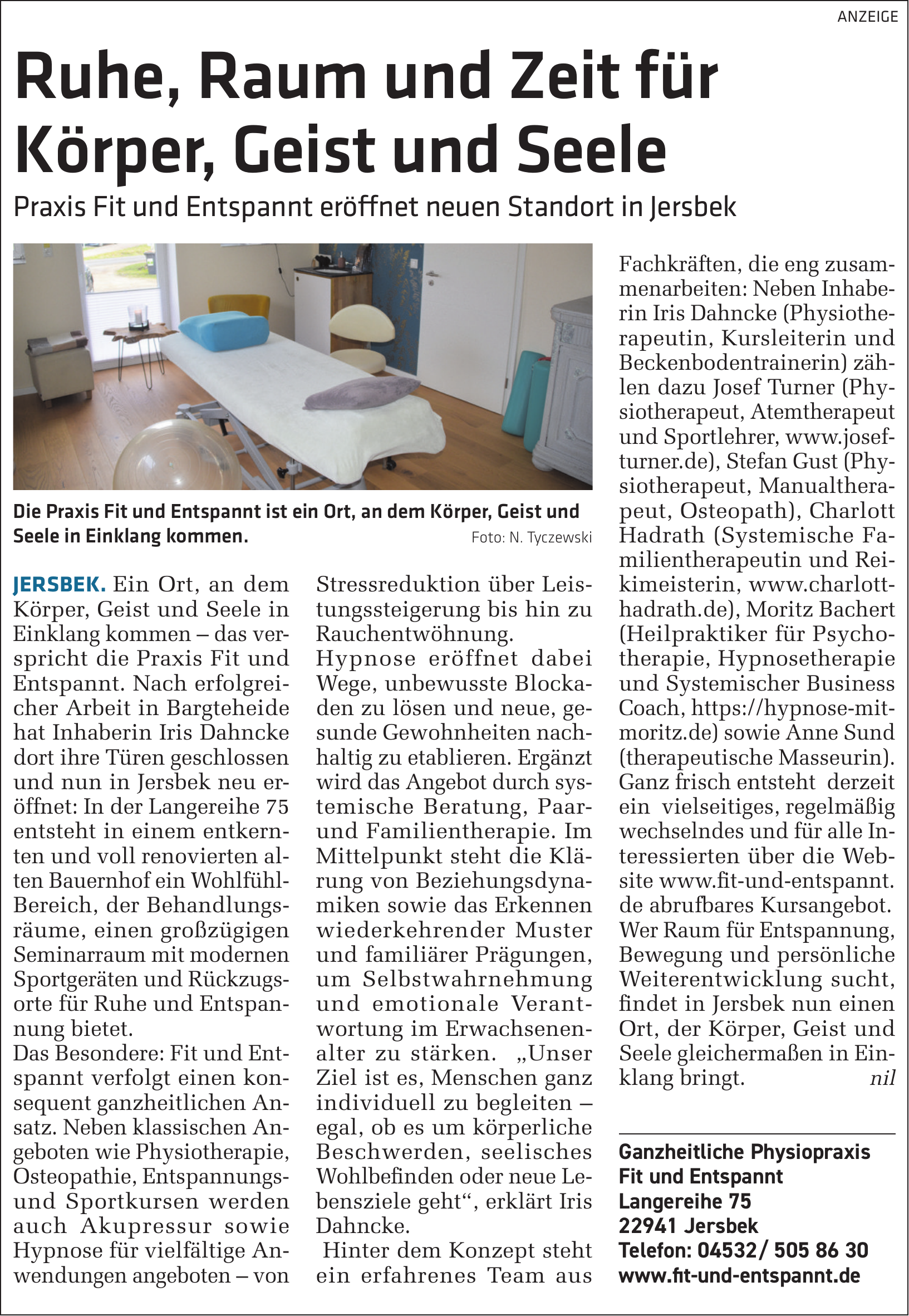 Mit ihrer Lage in Jersbek, in unmittelbarer Nähe zu bekannten Orten der Region, richtet sich die Praxis an Menschen, die Wert auf umfassende Gesundheitsförderung in angenehmer Umgebung legen. Die Kombination aus fachlicher Kompetenz, vielseitigen Therapie- und Kursangeboten sowie einer durchdachten Raumgestaltung macht Fit und Entspannt zu einer festen Adresse für Prävention, Therapie und Entspannung im Großraum Stormarn.