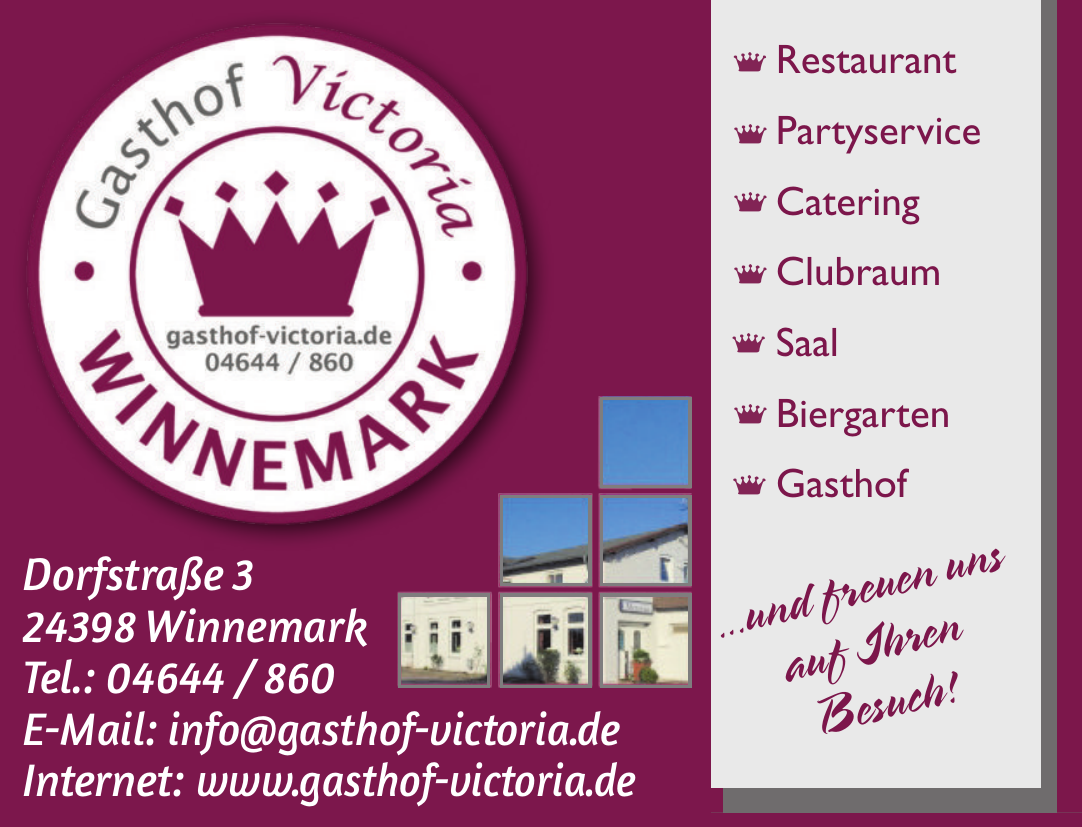 Der Gasthof Victoria ist in der Region für seine abwechslungsreichen Veranstaltungen bekannt. Dazu zählen Live-Musik, saisonale Feste, Comedy-Abende und plattdeutsche Theaterabende. Mit authentischer regionaler Küche, herzlicher Atmosphäre und maßgeschneidertem Service ist der Gasthof ein beliebter Treffpunkt für Einheimische und Gäste rund um Winnemark.