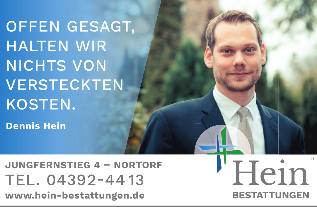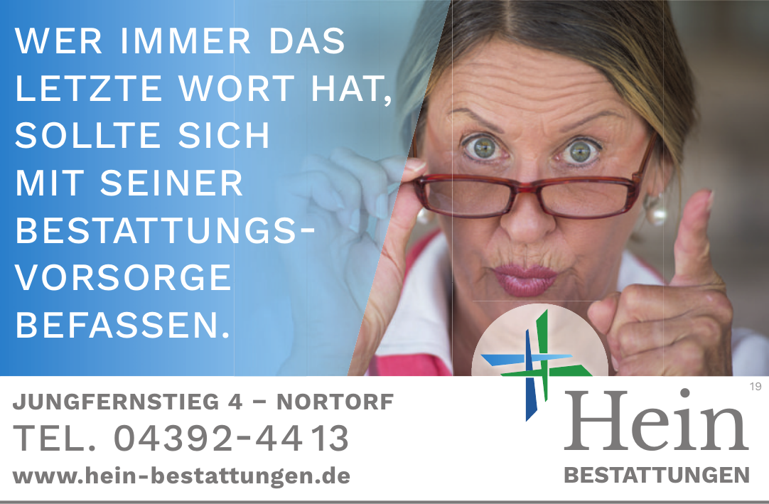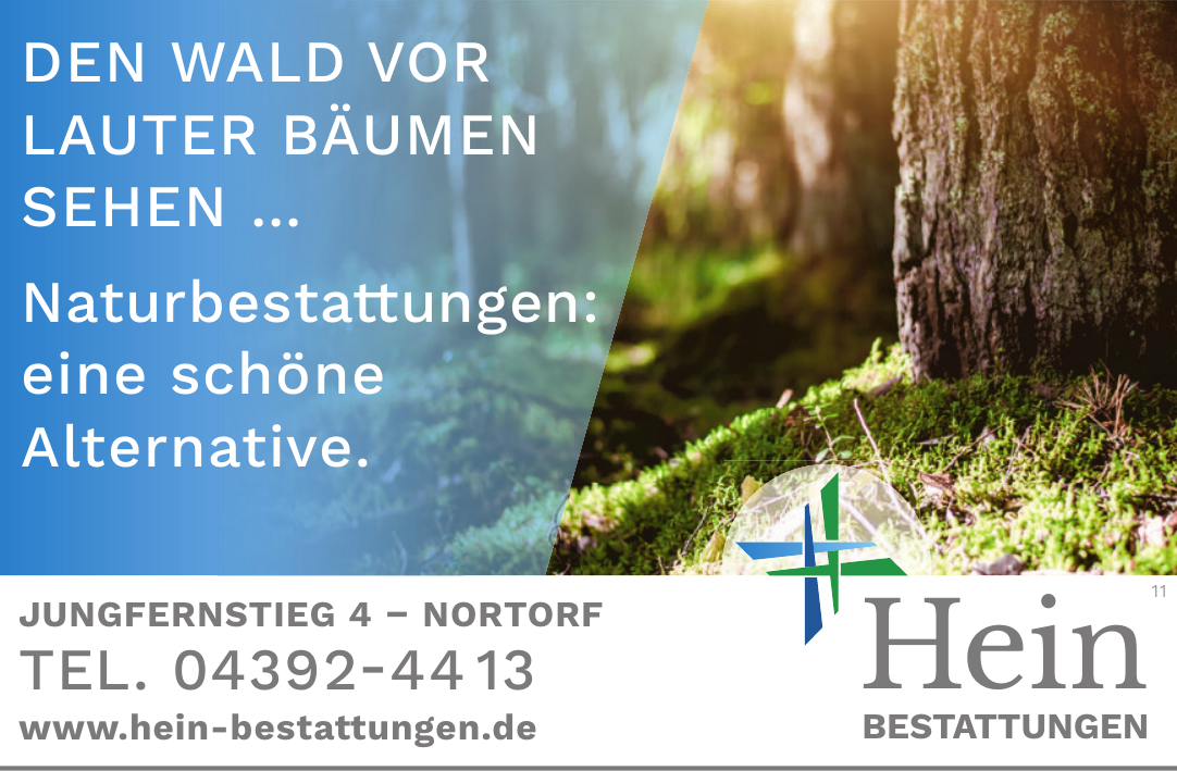 Ein wichtiger Schwerpunkt liegt auf der Bestattungsvorsorge: Interessierte können Vorsorgeverträge abschließen, um ihre eigene Bestattung frühzeitig abzusichern. Hein Bestattungen informiert zudem ausführlich zu Themen wie Patientenverfügung, Erbrecht, Testament und Organspende und steht bei der Organisation und Beratung unterstützend zur Seite.