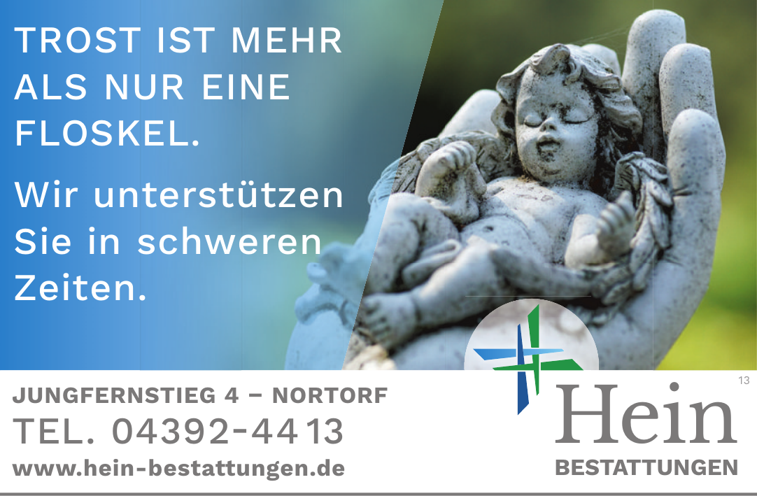 Hein Bestattungen blickt auf eine lange Geschichte als regional verankertes Bestattungsunternehmen zurück und betreibt mehrere Standorte in der Umgebung. Das Team ist spezialisiert auf die Organisation vielfältiger Bestattungsarten und legt großen Wert auf persönliche, empathische Begleitung der Hinterbliebenen. Die modern gestalteten Räumlichkeiten, die auf der firmeneigenen Webseite vorgestellt werden, bieten einen würdevollen Rahmen für individuelle Abschiednahmen.