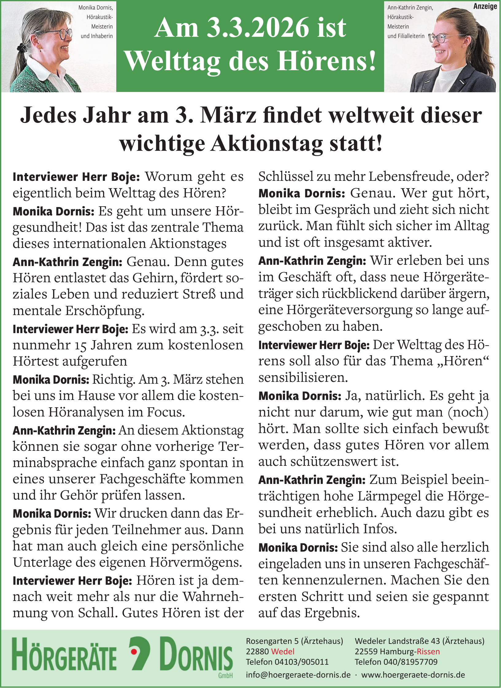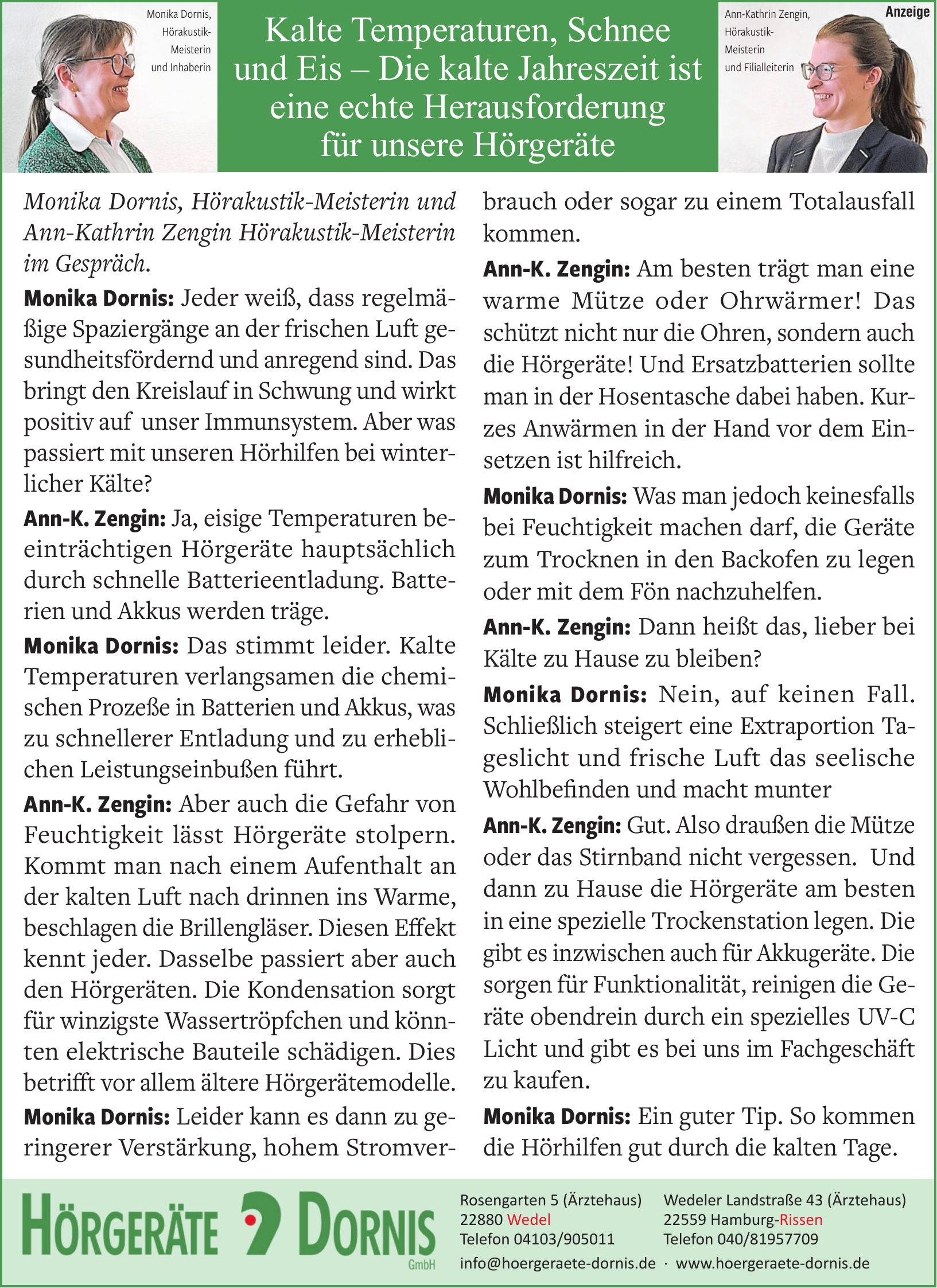 Hörgeräte Dornis hat zwei Standorte: in Wedel, Rosengarten 5 und in Hamburg-Rissen, Wedeler Landstraße 43.
