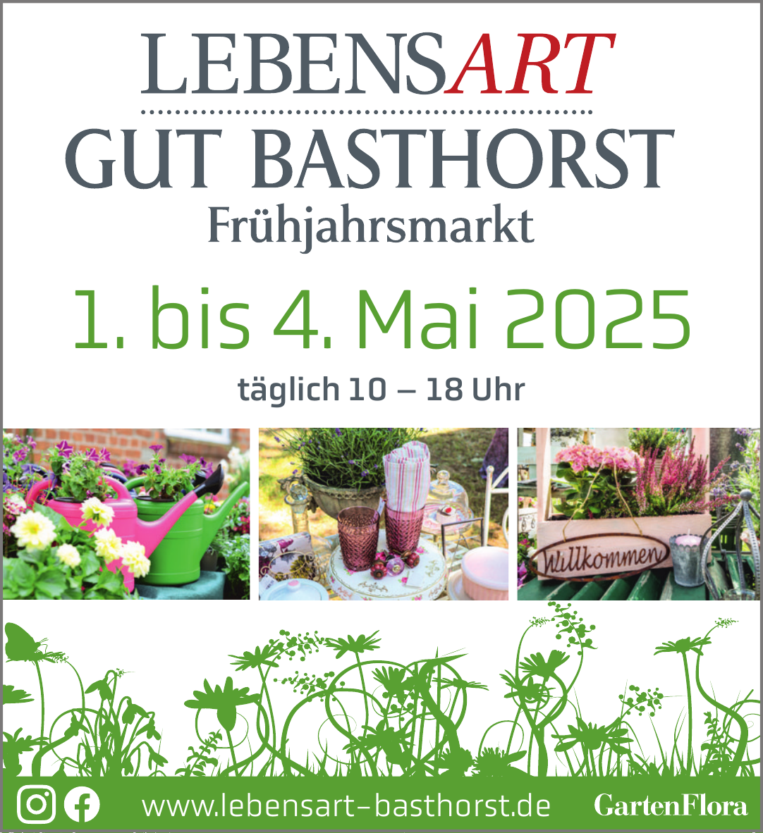 Vom 1. bis 4. Mai 2025 lädt der LebensArt Frühjahrsmarkt auf dem malerischen Gut Basthorst zu einem einzigartigen Erlebnis für die ganze Familie ein: Tauchen Sie ein in eine Welt voller Blumen und Pflanzen, Garten- und Handwerkskunst, Mode, Schmuck, Antiquitäten, Kleinkunst, regionaler Köstlichkeiten sowie Produkte rund um Wellness, Lifestyle und die schöne Art zu leben. Lassen Sie sich von der idyllischen Atmosphäre und dem Charme des Gutshofes verzaubern!