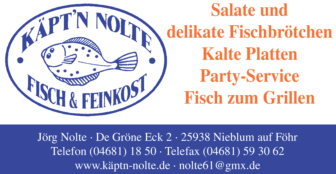 Käpt'n Nolte bietet eine große Auswahl an Frischfisch, Geräuchertem, hausgemachten Salaten, Feinkost, Fischplatten, Fischsalate, Suppen, Fischbrötchen, Krabben- und Fischsuppe sowie Langusten aus Kuba an.