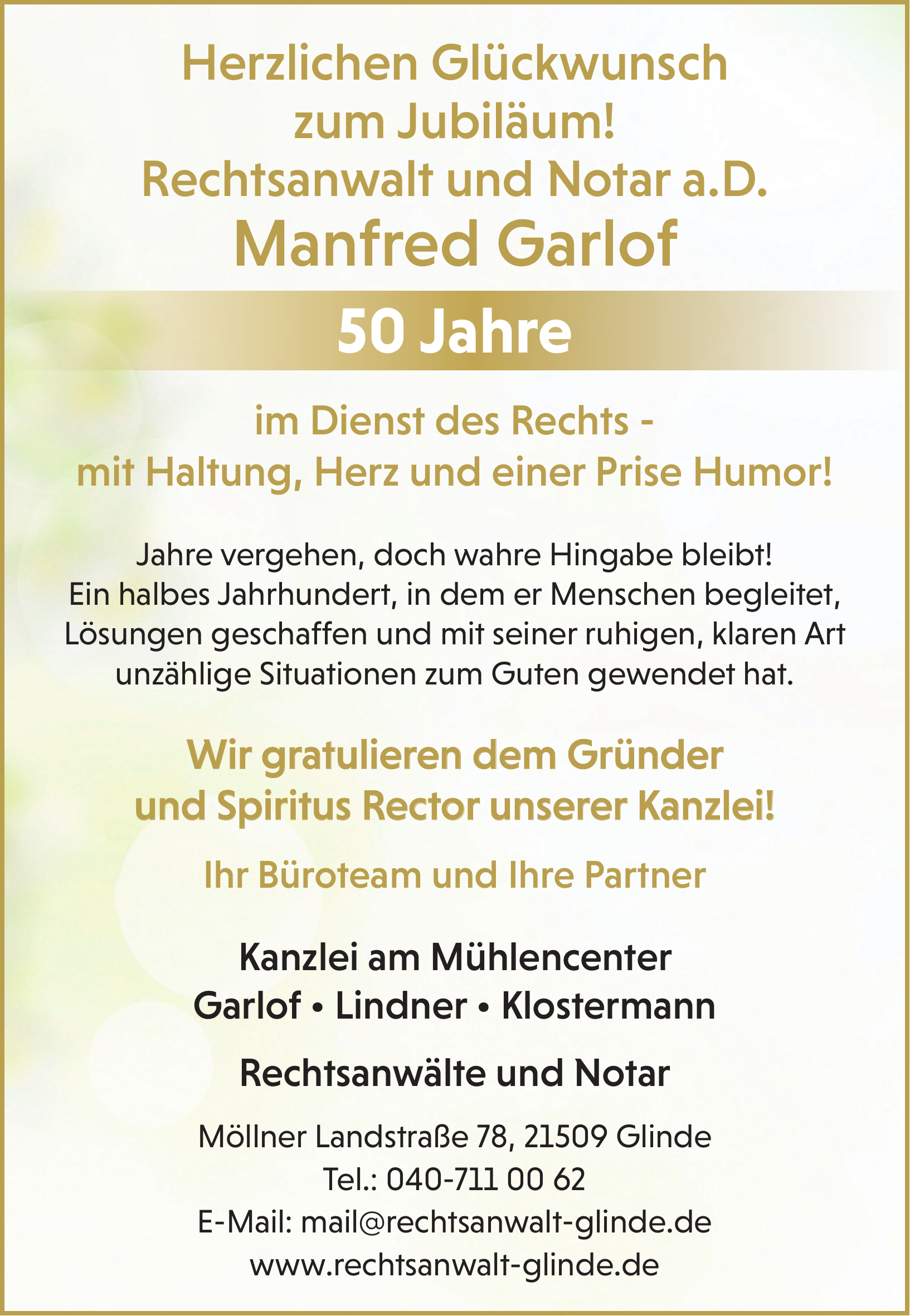 Die Kanzlei am Mühlencenter ist eine Rechtsanwalts- und Notarkanzlei in Glinde. Sie versteht sich als modernes Büro mit vier berufserfahrenen Rechtsanwälten und einem Notar und richtet sich an Privatpersonen sowie Unternehmen aus Glinde, Reinbek, Schwarzenbek, Oststeinbek, Barsbüttel und dem Großraum Hamburg und Stormarn.