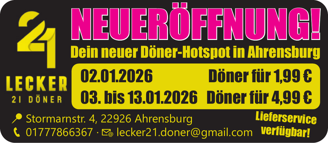 Mitten in Ahrensburg eröffnet am 15.01.2026 der neue Imbiss LECKER 21 DÖNER in der Stormarnstraße 4. Das Angebot richtet sich an alle, die Döner, Snacks und Take-away-Gerichte frisch und schnell genießen möchten. Der Standort ist gut erreichbar und ideal für den Hunger zwischendurch.