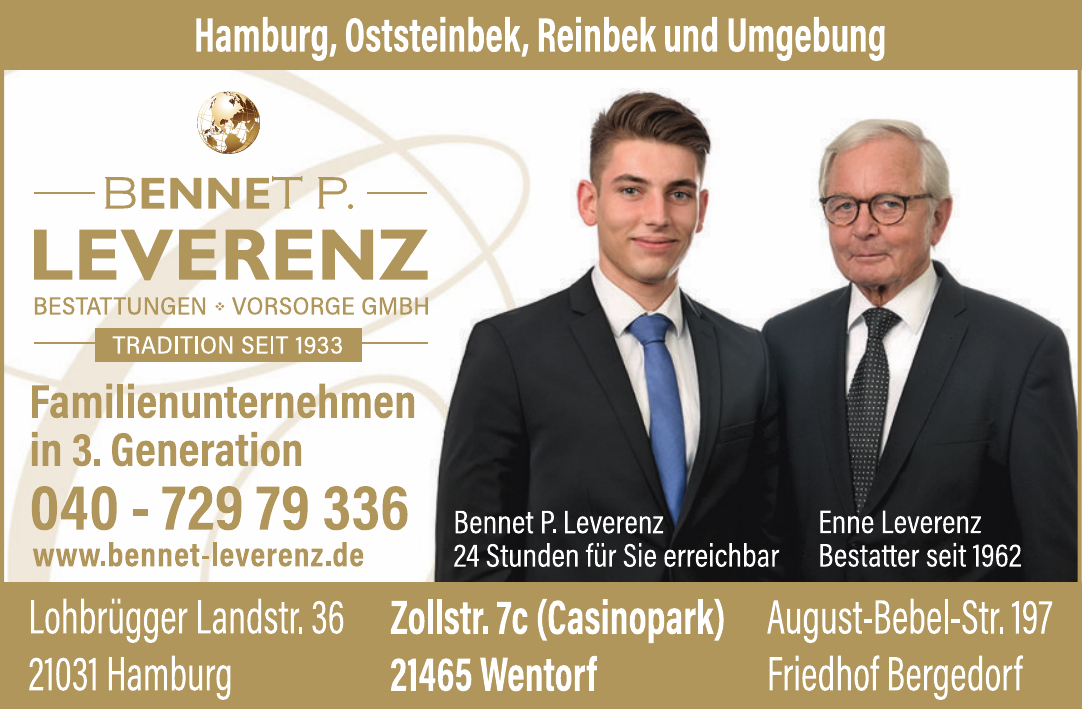 Seit drei Generationen steht Leverenz Bestattungen als Familienbetrieb für einfühlsame Begleitung im Trauerfall. Mit der Hauptgeschäftsstelle in Lohbrügge sowie weiteren Standorten in Bergedorf, Wentorf und Brunstorf ist das Unternehmen in Hamburg und der Region fest verwurzelt. Im Mittelpunkt stehen Menschlichkeit, Würde und die individuelle Gestaltung von Abschied und Vorsorge.