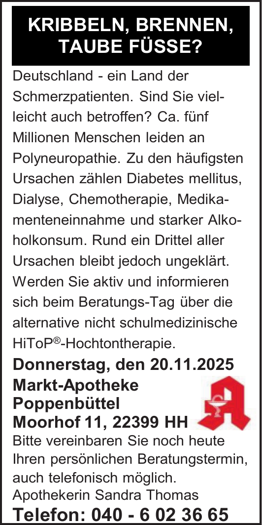Im Herzen von Poppenbüttel steht die Markt-Apotheke Poppenbüttel als kompetente Anlaufstelle für alle Fragen rund um Gesundheit und Wohlbefinden bereit. Unter der Leitung von Sandra Thomas bietet das engagierte Team ein breites Spektrum pharmazeutischer Dienstleistungen mit besonderem Fokus auf individuelle Beratung. Zum Service gehören professionelle Blutdruckmessungen, diskrete Inkontinenzberatung sowie die fachgerechte Anpassung von Kompressionsstrümpfen in unterschiedlichen Größen und Farben.