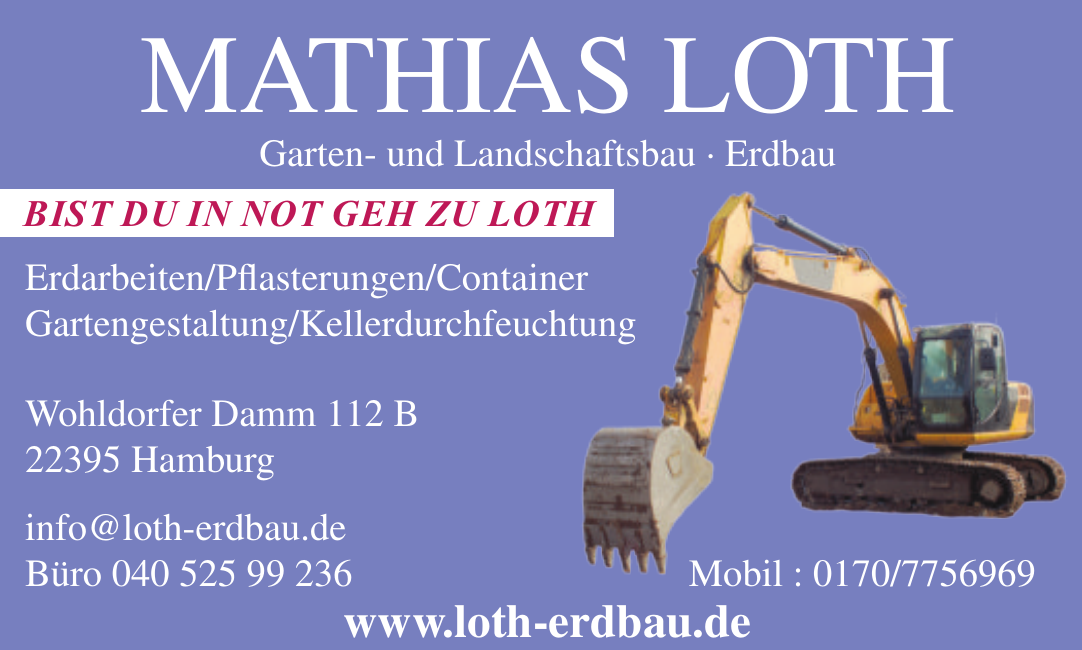Seit über 25 Jahren steht das familiengeführte Unternehmen Loth Garten- und Landschaftsbau für professionelle Gestaltung und Pflege von Außenanlagen in Hamburg und Umgebung. Unter der Leitung von Mathias Loth, gemeinsam mit seiner Frau Carmen und Sohn Christopher, bietet der Betrieb ein breites Spektrum an Leistungen – von der Planung individueller Gartenanlagen über Bepflanzungen bis hin zum Bau von Zäunen, Friesenwällen sowie der Erneuerung und Umgestaltung bestehender Grünflächen.