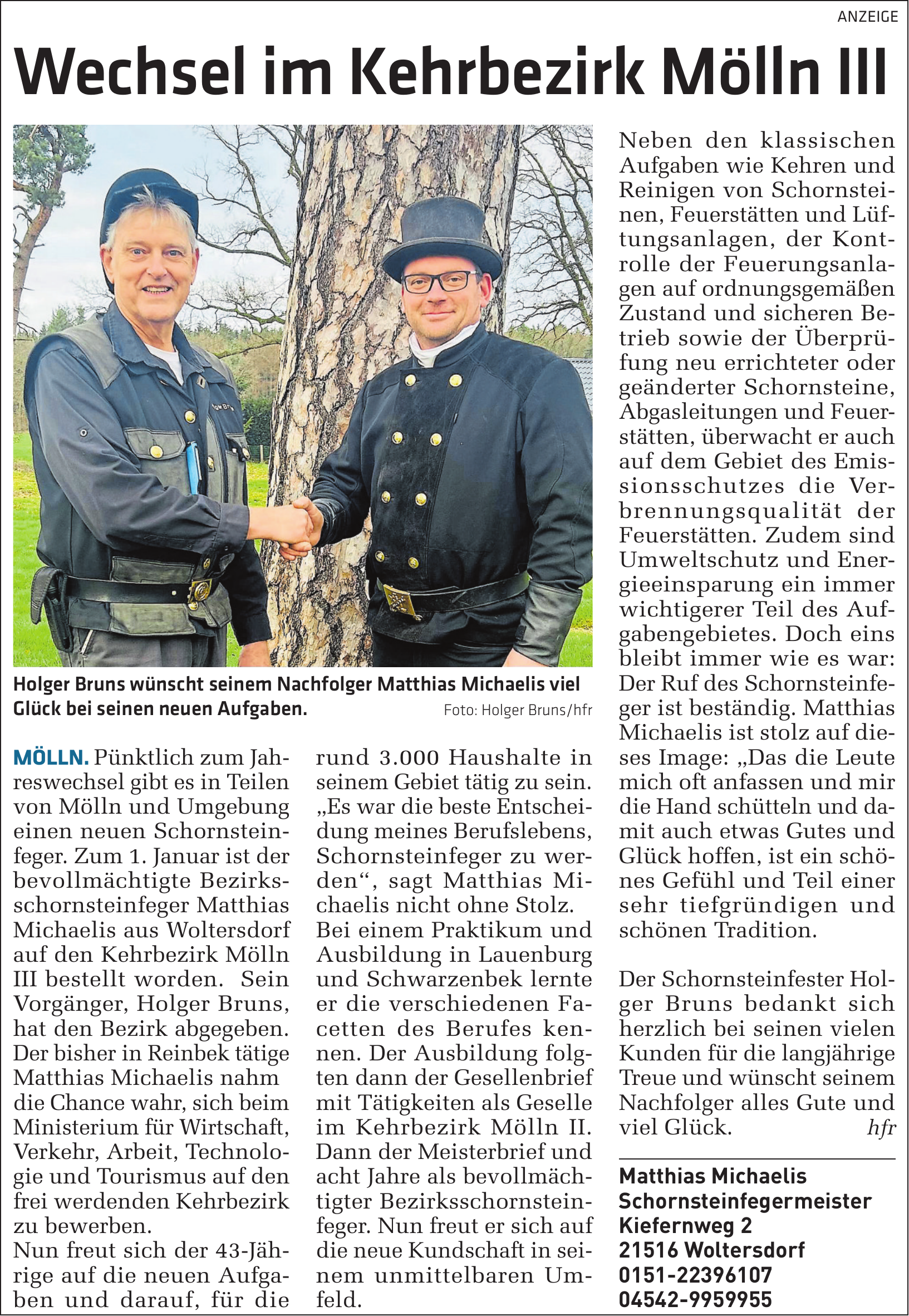 Matthias Michaelis ist als Schornsteinfegermeister in Woltersdorf tätig und betreibt dort einen Schornsteinfegerbetrieb mit Schwerpunkt auf Schornsteinfegerarbeiten. Als bevollmächtigter Bezirksschornsteinfeger für den entsprechenden Kehrbezirk übernimmt Michaelis die klassischen Aufgaben der Schornsteinfegerarbeit. Dazu zählen unter anderem die Überprüfung und Reinigung von Feuerstätten und Schornsteinen, um die Sicherheit von Heizungsanlagen und Feuerungsanlagen zu gewährleisten.