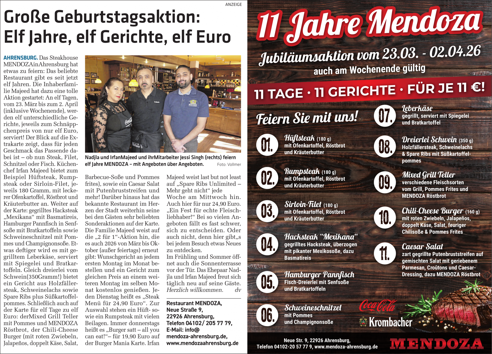 Mit seinem vielfältigen Angebot, der besonderen Dry-Aged-Spezialität und dem gemütlichen Ambiente ist das Steakhouse Mendoza eine gefragte Adresse für Genießer aus Ahrensburg und dem Umland.
