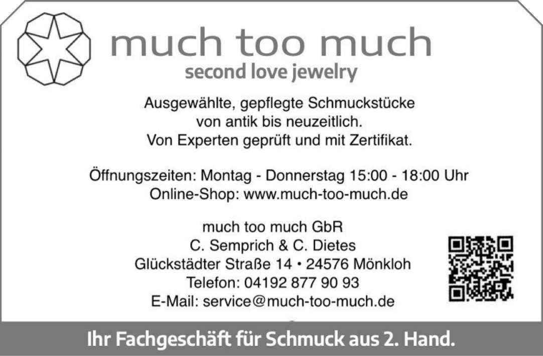 Im Fachgeschäft much too much in Mönkloh finden Schmuckliebhaber eine breite Auswahl an zertifiziertem Schmuck aus zweiter Hand. Das Sortiment umfasst sorgfältig geprüfte Ringe, Ketten, Armbänder und weitere Schmuckstücke, die bereits eine Geschichte erzählen und nun eine neue Wertschätzung erfahren.