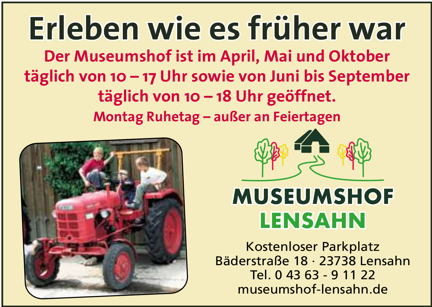 Der Museumshof Lensahn listet Bevorstehende Veranstaltungen wie Lensahn singt, Maifest, Motorradtreffen, Schafmarkt, Sommer-Flohmarkt, Kinderfest, Hof-Markt, Gewerbefest, Oldtimer-Treffen, Garbenfest, Kartoffelfest, Irischer Abend, Pferdetag, Landmarkt, Erntedankfest und Martinsmarkt. Hinweis: weitere Termine finden Sie auf der jeweiligen Unterseite der Veranstaltungen.
