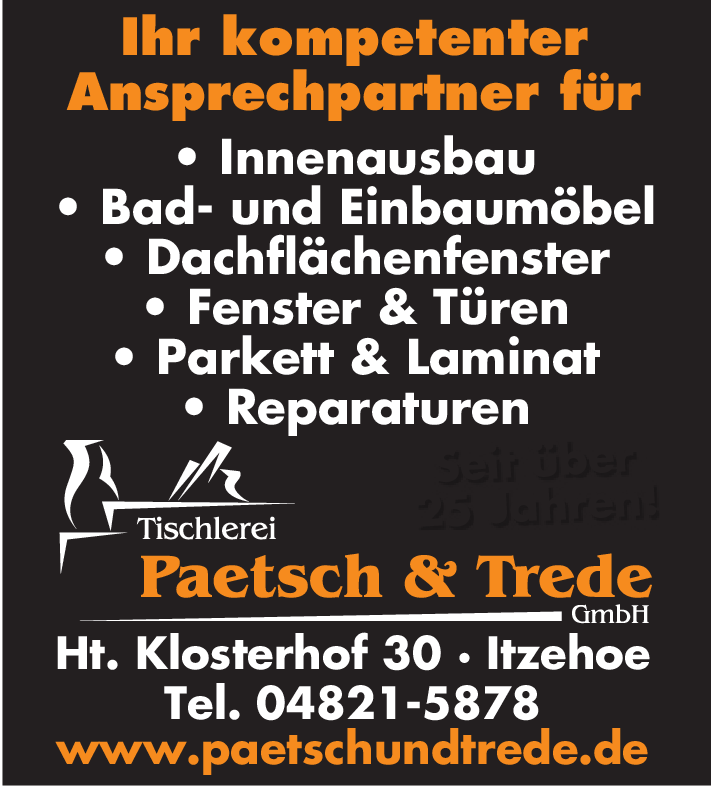 Die Tischlerei Paetsch & Trede in Itzehoe bietet eine Vielzahl von handwerklichen Leistungen an, darunter die Herstellung von Fenstern, Türen, Küchen, Schränken, Bodenbelägen sowie Geschäftsmobiliar.