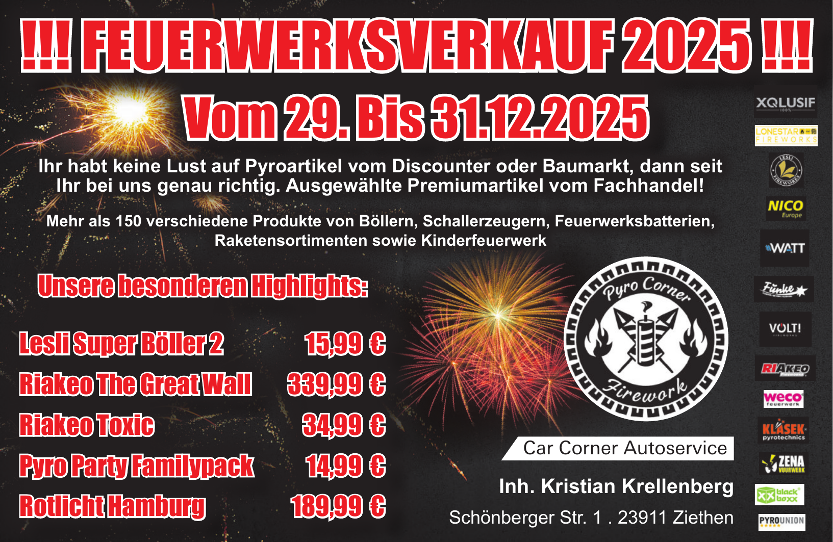 Mit Sitz in Ziethen, nahe dem bekannten Car Corner Autoservice, präsentiert sich Pyro Corner Firework als Fachhandel für Feuerwerksartikel mit Fokus auf hochwertige Pyrotechnik. Das Geschäft richtet sich an Kundinnen und Kunden, die gezielt auf Qualitätsprodukte setzen und bewusst auf Feuerwerk aus Discountern oder Baumärkten verzichten. Die Verkaufsfläche vor Ort ermöglicht eine ansprechende Auswahl an exklusiven Artikeln.