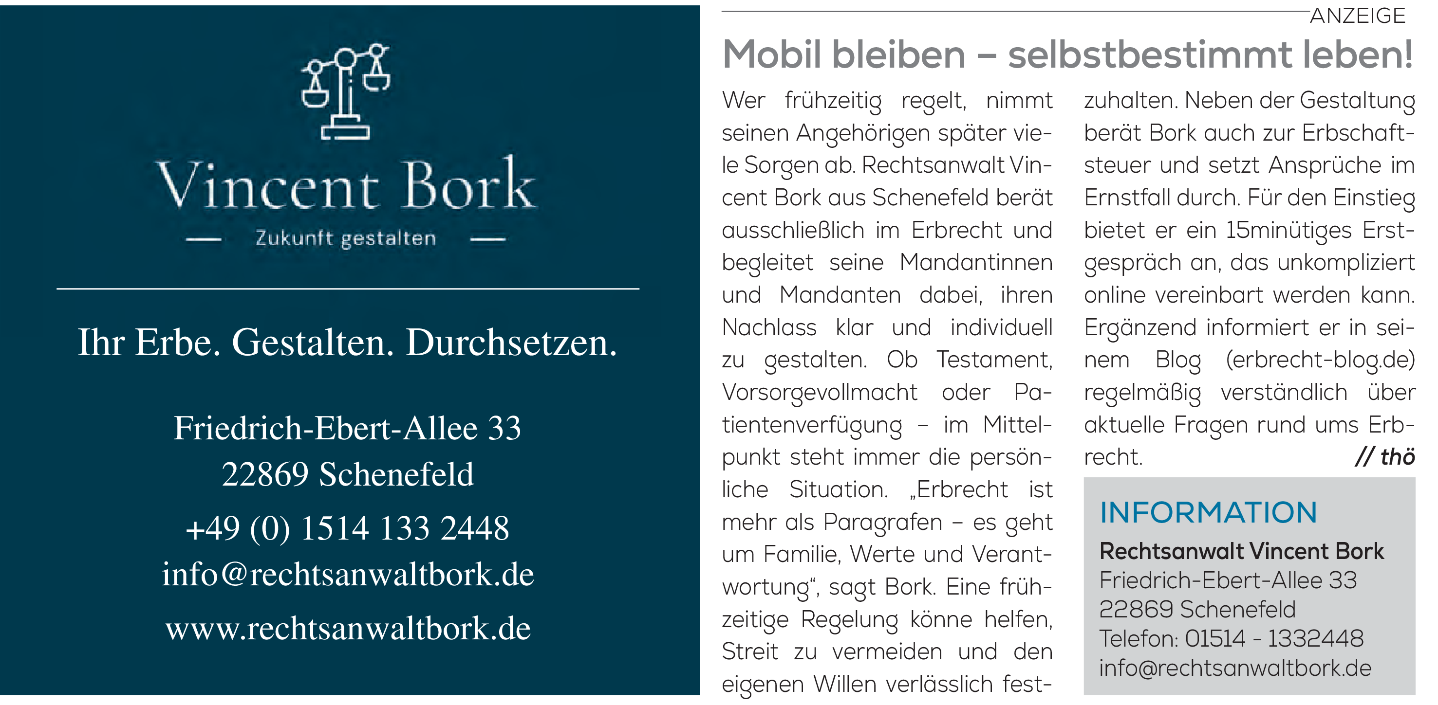 Wer frühzeitig regelt, nimmt seinen Angehörigen später viele Sorgen ab. Rechtsanwalt Vincent Bork aus Schenefeld berät ausschließlich im Erbrecht und begleitet seine Mandantinnen und Mandanten dabei, ihren Nachlass klar und individuell zu gestalten. Ob Testament, Vorsorgevollmacht oder Patientenverfügung – im Mittelpunkt steht immer die persönliche Situation. „Erbrecht ist mehr als Paragrafen – es geht um Familie, Werte und Verantwortung“, sagt Bork. Eine frühzeitige Regelung könnte helfen, Streit zu vermeiden und den eigenen Willen verlässich festzuhalten.