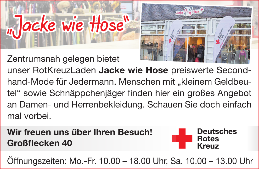 Der Rotkreuzladen „Jacke wie Hose“ ist ein Second-Hand-Shop, der vom DRK-Kreisverband Neumünster betrieben wird. Hier finden modebewusste Kundinnen und Kunden hochwertige, gebrauchte Kleidung zu fairen Preisen. Das vielfältige Sortiment umfasst Damen- und Herrenmode, Vintage-Highlights, Sport- und Freizeitkleidung sowie eine große Auswahl an Accessoires wie Schals, Tücher, Krawatten, Modeschmuck, Schuhe, Mützen, Kappen und Hüte. Besonderer Wert wird auf die Qualität der angebotenen Artikel gelegt: Jedes Kleidungsstück wird sorgfältig geprüft und präsentiert sich in einwandfreiem Zustand.