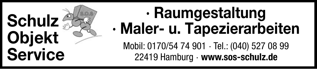 Schulz Objekt Service bietet Objekt Service, Haushaltsauflösungen, Räumungen (Privat und Gewerbe), Entrümpelung, Hausmeisterdienste und Kleintransporte aller Art. Weitere Leistungen umfassen Streich- und Tapezierarbeiten, Gartenarbeiten sowie Holz- und Bautenschutz. Außerdem vermittelt Schulz Objekt Service Handwerker (Elektriker, Fliesenleger, Klempner, Fußbodenleger).