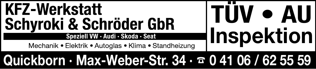 Schyroki & Schröder GbR in Quickborn betreibt eine Kfz-Werkstatt mit Fokus auf Inspektionen, Ölwechsel und Fahrzeugreparaturen. Die GbR wird von Andreas Schyroki und Peter Schröder geführt und bietet elektronische Fahrzeugdiagnose an. Die Werkstatt bedient alle Marken im Raum Pinneberg und Segeberg.