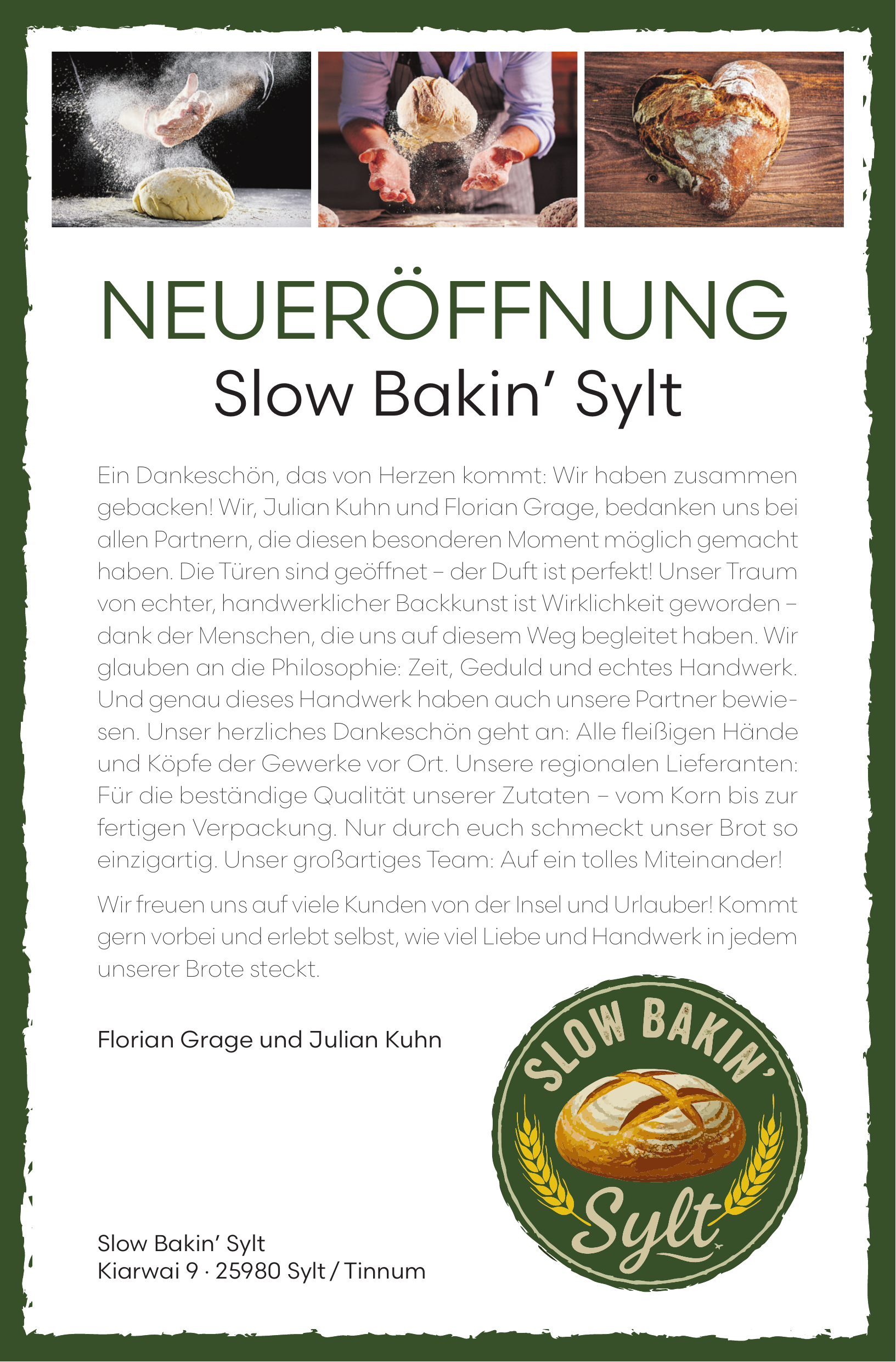 Ein Dankeschön, das von Herzen kommt: Wir haben zusammen gebacken! Wir, Julian Kuhn und Florian Grage, bedanken uns bei allen Partnern, die diesen besonderen Moment möglich gemacht haben. Die Türen sind geöffnet – der Duft ist perfekt! Unser Traum von echter, handwerklicher Backkunst ist Wirklichkeit geworden – dank der Menschen, die uns auf diesem Weg begleitet haben. Wir glauben an die Philosophie: Zeit, Geduld und echtes Handwerk. Und genau dieses Handwerk haben auch unsere Partner bewiesen. Unser herzliches Dankeschön geht an: Alle fleißigen Hände und Köpfe der Gewerke vor Ort. Unsere regionalen Lieferanten: Für die beständige Qualität unserer Zutaten – vom Korn bis zur fertigen Verpackung. Nur durch euch schmeckt unser Brot so einzigartig. Unser großartiges Team: Auf ein tolles Miteinander!
