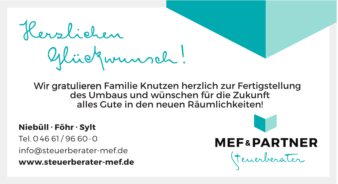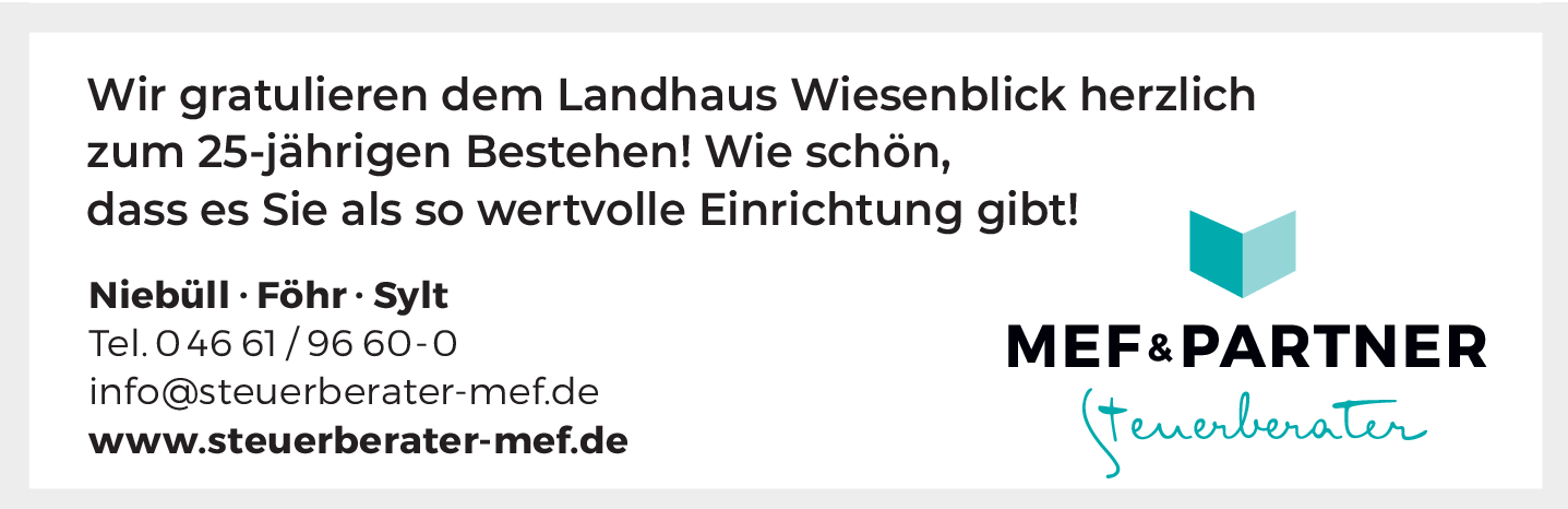 Steuerberater MEF & Partner bietet umfassende Steuerberatung, wirtschaftliche Unternehmensberatung und betriebswirtschaftliche Beratung aus einer Hand. Seit 1973 steht die Sozietät ihren Mandanten zur Seite und hat sich mit über 90 engagierten Mitarbeitern an drei Standorten einen Namen gemacht. In Niebüll sind sie seit 1979 tätig, wo über 75 Mitarbeiter bereitstehen. Der Standort in Wyk auf Föhr wurde 2003 eröffnet und beschäftigt rund 10 Mitarbeiter. Seit 2010 ist das Unternehmen auch in Tinnum auf Sylt vertreten, wo fünf Mitarbeiter für die Kunden da sind.
