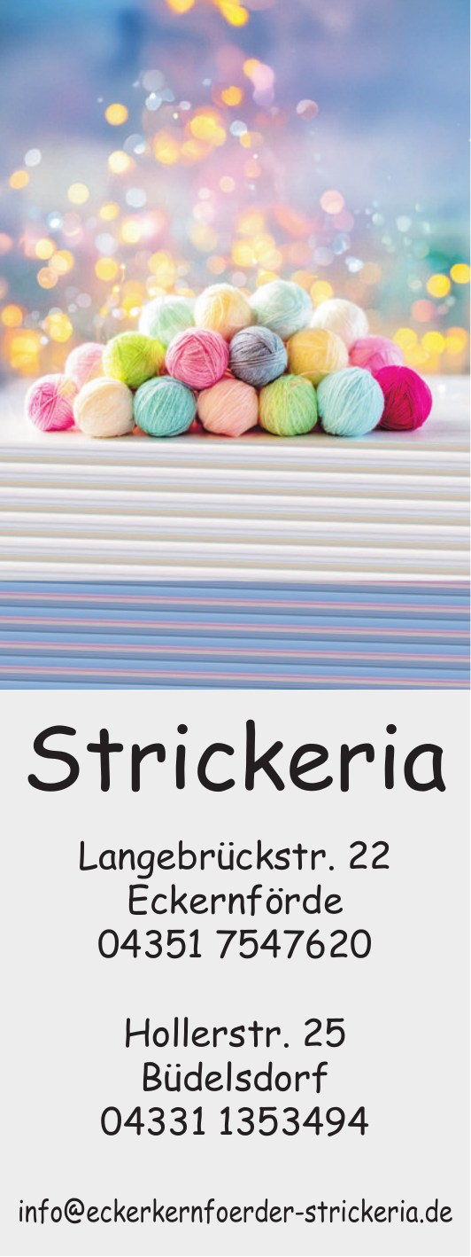 Seit 2011 ist die Strickeria als Fachgeschäft für Wolle und Strickbedarf in Eckernförde etabliert. Mit einer großen Auswahl an Qualitätsgarnen wie Schafwolle, Alpaka, Mohair, Kaschmir und Baumwolle sowie Strickzubehör renommierter Marken wie Opal, Lana Grossa, Mood und Knit Pro, hat sich das Geschäft zur ersten Adresse für Strickliebhaberinnen und -liebhaber in der Region entwickelt. Neben dem Hauptsitz in Eckernförde betreibt die Strickeria eine weitere Filiale in Büdelsdorf.