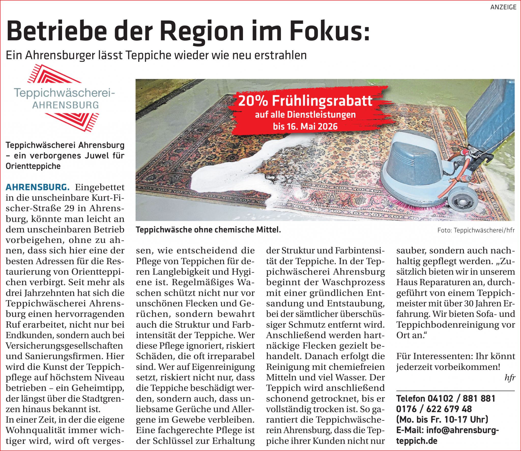 Teppichwäscherei Ahrensburg arbeitet seit 1985/Orientteppich-Restauration seit 1985, und der Standort ist Kurt-Fischer-Straße 29, 22926 Ahrensburg. Das Unternehmen betont langjährige Erfahrung und Professionalität.