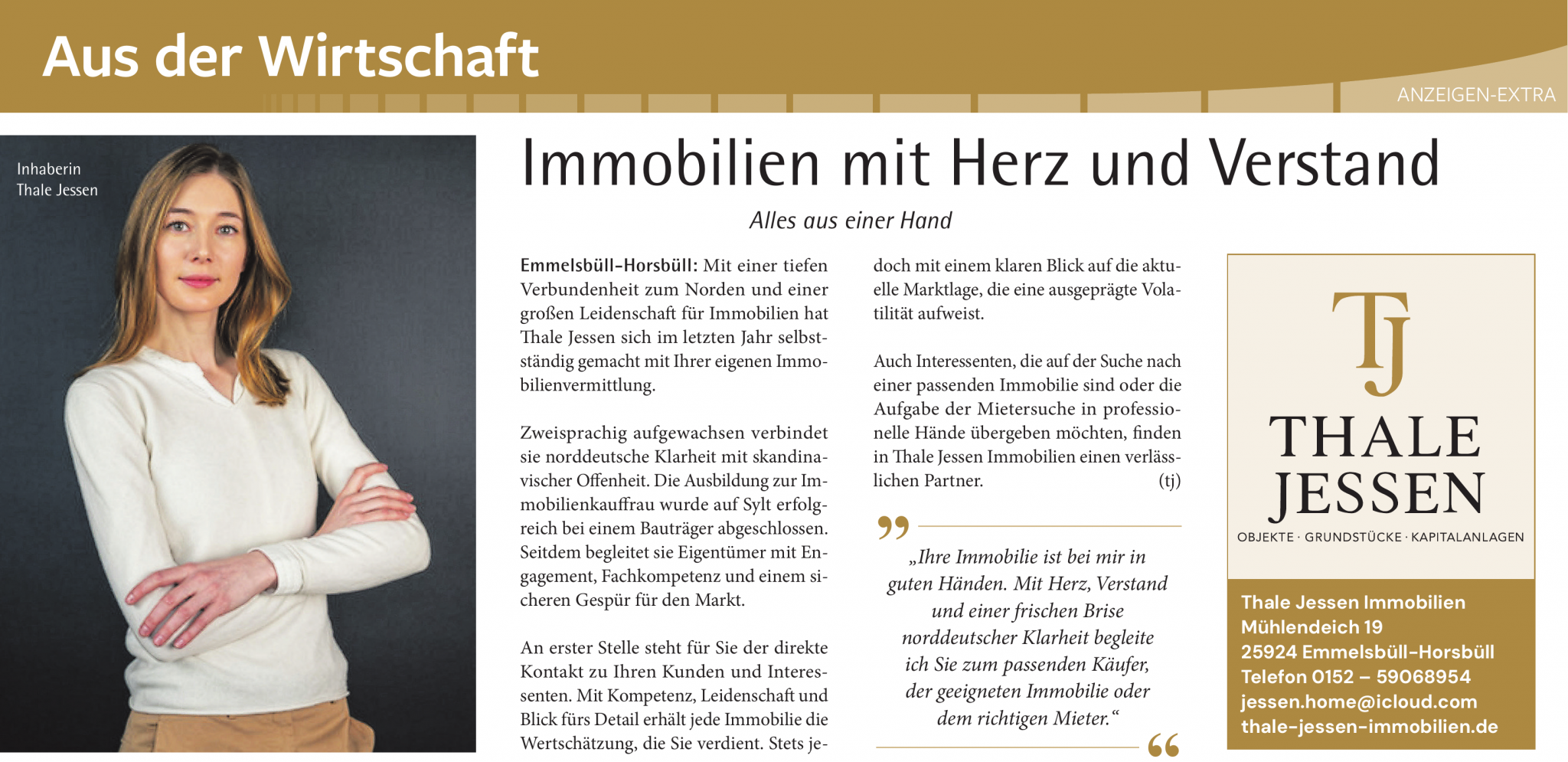 Die Marke Thale Jessen Immobilien steht für unkomplizierte Abläufe, persönliche Nähe und Zuverlässigkeit. Mit starkem Fokus auf den norddeutschen Raum und ausgeprägter lokaler Präsenz versteht sich das Unternehmen als vertrauenswürdiger Ansprechpartner für alle, die ein neues Zuhause suchen, eine Immobilie verkaufen oder in Immobilien investieren möchten.