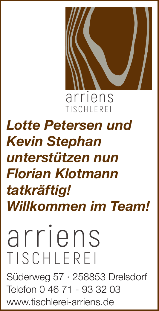 Seit 2006 bereichert die Tischlerei Arriens die Handwerkslandschaft Nordfrieslands. Unter der Leitung von Tischlermeister Peter Arriens bringt das Unternehmen mehr als drei Jahrzehnte Erfahrung in die Entwicklung individueller Holzlösungen ein. Kunden aus Sylt, Husum, Niebüll und der gesamten Region profitieren von der Verbindung aus traditioneller Handwerkskunst und modernster Fertigungstechnik, die in der hauseigenen, technisch fortschrittlichen Werkstatt zum Einsatz kommt.