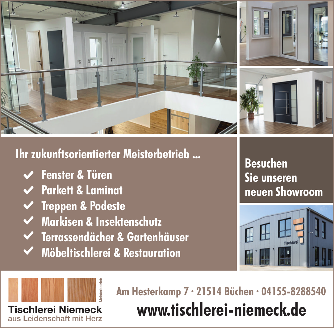 Die Tischlerei Niemeck GmbH & Co. KG bietet Dienstleistungen wie die Herstellung von Fenstern und Türen, Parkett- und Laminatböden, Einbauschränken, Terrassendächer, Wintergärten sowie Sonnenschutzlösungen an.