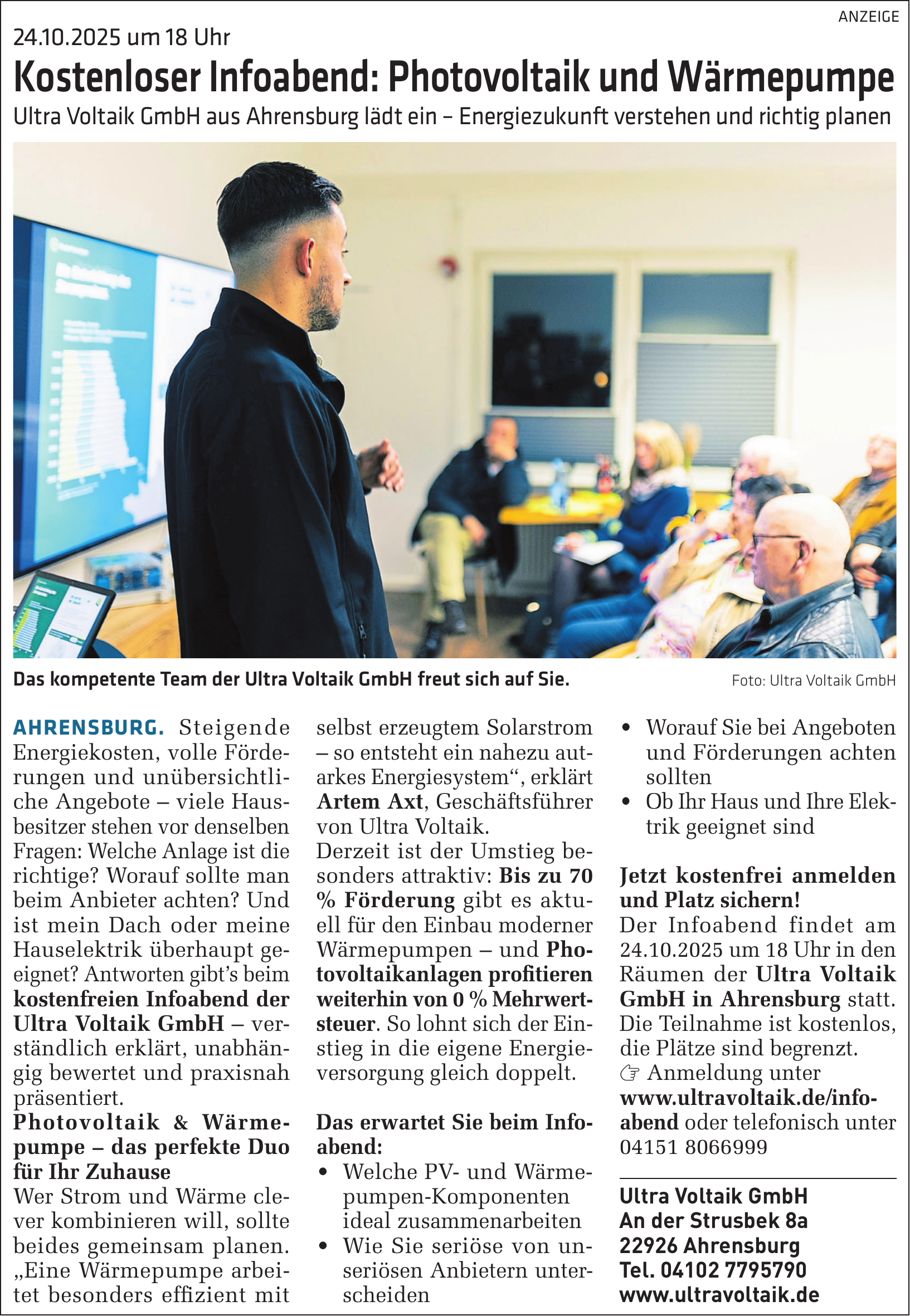Ultra Voltaik GmbH bietet Photovoltaikanlagen, Wärmepumpen, Mieterstrommodelle sowie ganzheitliche Energielösungen an, um den Energiebedarf zu reduzieren und Geld zu sparen.