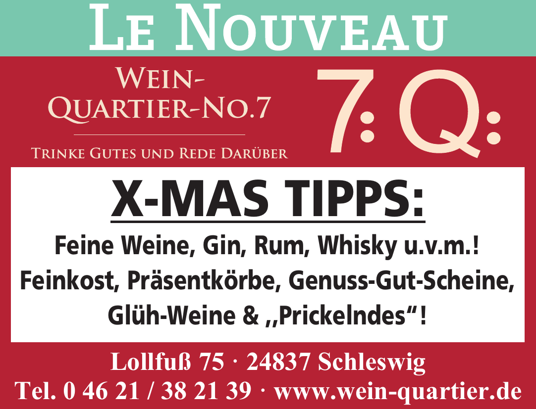 Wein-Quartier-No.7 Weinhandlung in Schleswig bietet fachkundige Beratung, Verkostungen, Lieferservice, Präsentservice sowie Gastronomieberatung und -Betreuung; das Team steht Ihnen mit Rat und Tat rund um den Genuss zur Seite.