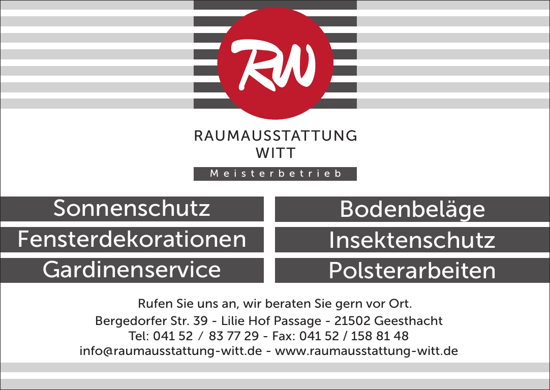 Witt Raumausstattung bietet unverbindliche und kostenlose Beratung bei Ihnen zu Haus. Das Unternehmen legt großen Wert darauf, Ihre Wünsche vorab genau kennenzulernen, damit Ihre Räume optimal gestaltet werden. Witt Raumausstattung ist Ihr Sonnenschutz-Spezialist in Geesthacht und berät vor Ort.