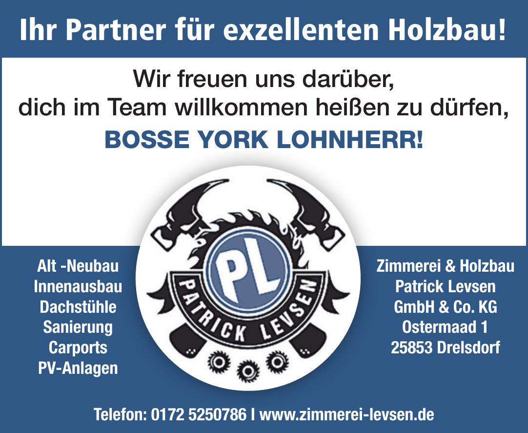 Zimmerei & Holzbau Patrick Levsen, ein angesehenes Unternehmen in Drelsdorf, Nordfriesland, hat sich auf hochwertige Zimmerer- und Holzbauarbeiten spezialisiert. Unter der Leitung von Patrick Levsen kombiniert das Team traditionelle Handwerkskunst mit modernster Technologie, um maßgeschneiderte Lösungen für ihre Kunden zu bieten. Die zentrale Lage des Unternehmens ermöglicht es ihnen, Projekte in ganz Norddeutschland effizient und zuverlässig abzuwickeln.